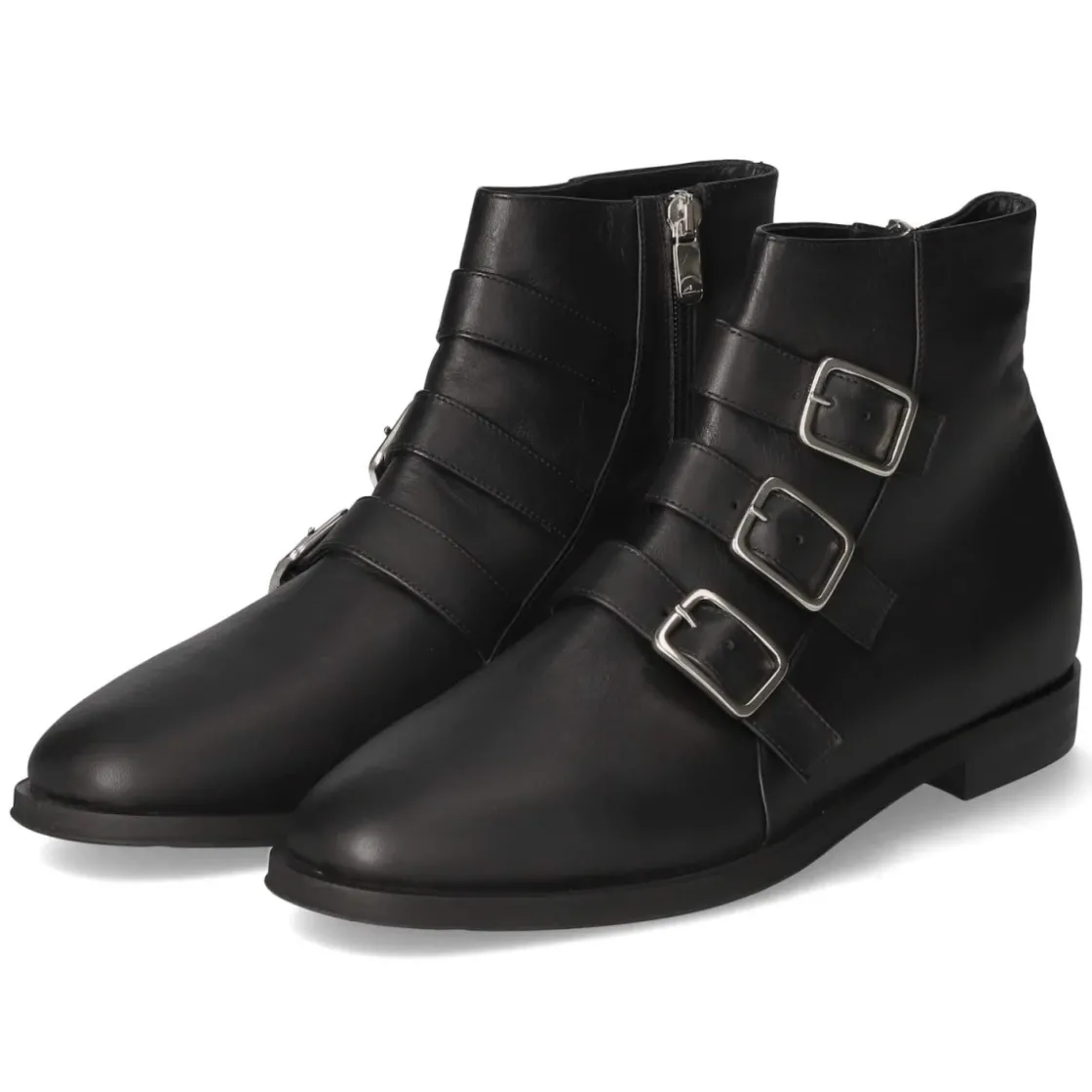 Die Stiefeletten von 42Plus stehen für zeitlose Eleganz und zuverlässigen Komfort. Glattleder in sattem Schwarz und eine runde Spitze verleihen eine edle Optik, während robustes Echtleder und hochwertige Verarbeitung Langlebigkeit sichern. Ein seitlicher Reißverschluss erleichtert den Einstieg, drei Zierriemen mit silberfarbenen Metallschnallen und feine Ziernähte setzen markante Akzente. Die hautfreundliche Lederdecksohle, das leichte Lederfutter und das leicht gepolsterte Lederfußbett unterstützen ein angenehmes Tragegefühl. Mit flexible Laufsohle und kleinem Blockabsatz von 3 cm bietet das Modell Stabilität im Alltag. Die Passform fällt normal aus. Made in Italy unterstreicht den Premium-Anspruch. Modetipp: Besonders wirkungsvoll zu schmalen Jeans und einem strukturierten Wollmantel oder als eleganter Kontrast zu einem fließenden Midi-Kleid.