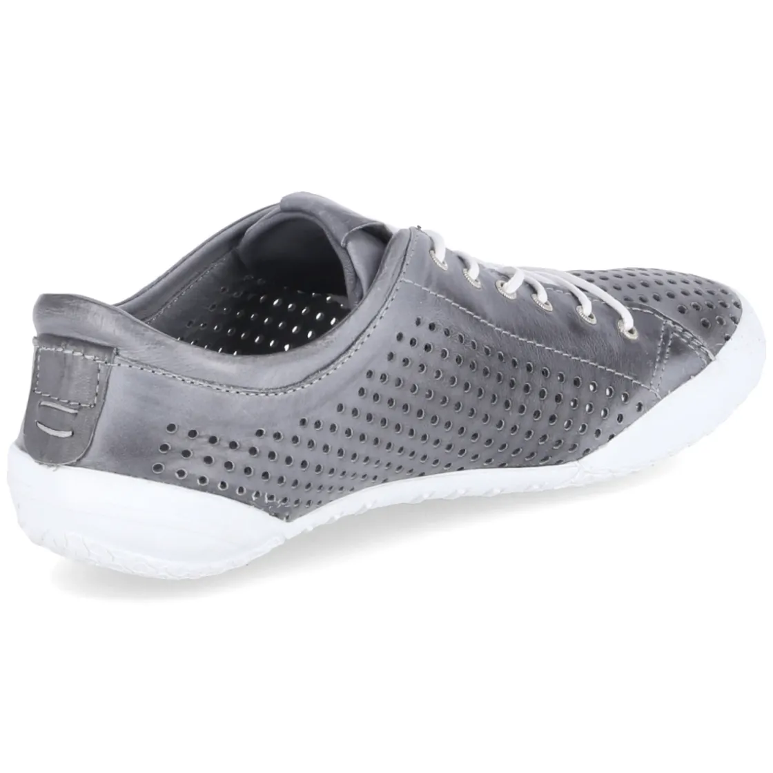 Der Low Sneaker von Andrea Conti zeigt sich in zeitlosem Grau und verbindet luftig gelochtes Glattleder mit relaxter Leichtigkeit. Das langlebige Echtleder schmiegt sich dank weichem Lederfutter angenehm an den Fuß, während die gepolsterte Zunge und die komfortable Wechseldecksohle zusätzlichen Komfort bieten. Die runde Spitze mit verstärktem Zehenbereich sorgt für Schutz im Alltag, die flexible, rutschhemmende Laufsohle für zuverlässigen Halt auf unterschiedlichsten Untergründen. Durch die klassische Schnürung lässt sich die Passform individuell regulieren; das Wechselfußbett erlaubt den Einsatz eigener Einlagen. Der Schuh fällt größengetreu aus und überzeugt als vielseitiger Begleiter für Alltag und Reise. Modetipp: In Kombination mit Cropped-Jeans, gestreiftem Shirt und lockerem Blazer entsteht ein lässig-eleganter Look, der das dezente Grau harmonisch aufgreift.