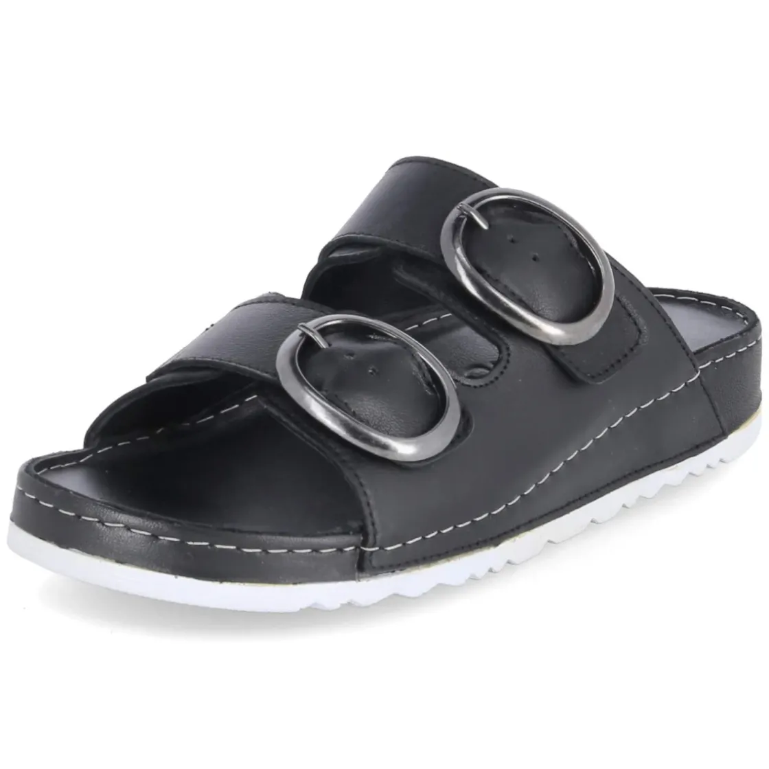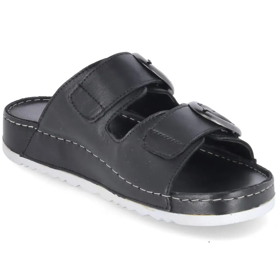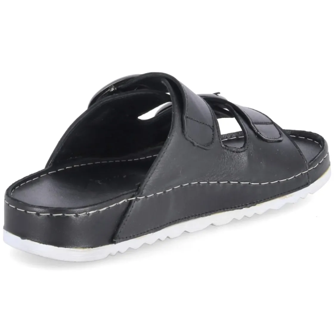 Diese Pantoletten von Andrea Conti verbinden reduziertes Design und hohen Tragekomfort. Das Obermaterial aus langlebigem Echtleder zeigt sich in zeitlosem Schwarz und wird von zwei Riemen mit Schnalle getragen, deren Elastikeinsatz sanft nachgibt und so passgenauen Halt schenkt. Die offene Zehenpartie wirkt luftig, das weiche Lederfutter und die hautfreundliche Lederdecksohle schmiegen sich angenehm an. Ein gepolstertes Lederfußbett entlastet bei jedem Schritt, während die flexible Laufsohle mit leichtem Profil für ein natürliches Abrollen sorgt. Der Schnitt fällt normal aus und macht die Wahl der gewohnten Größe unkompliziert. Modetipp: Zu luftigen Leinenhosen und einer kastigen Bluse entsteht ein moderner Sommerlook; eine schwarze Crossbody-Bag und filigraner Schmuck greifen die elegante Schlichtheit des Modells souverän auf.