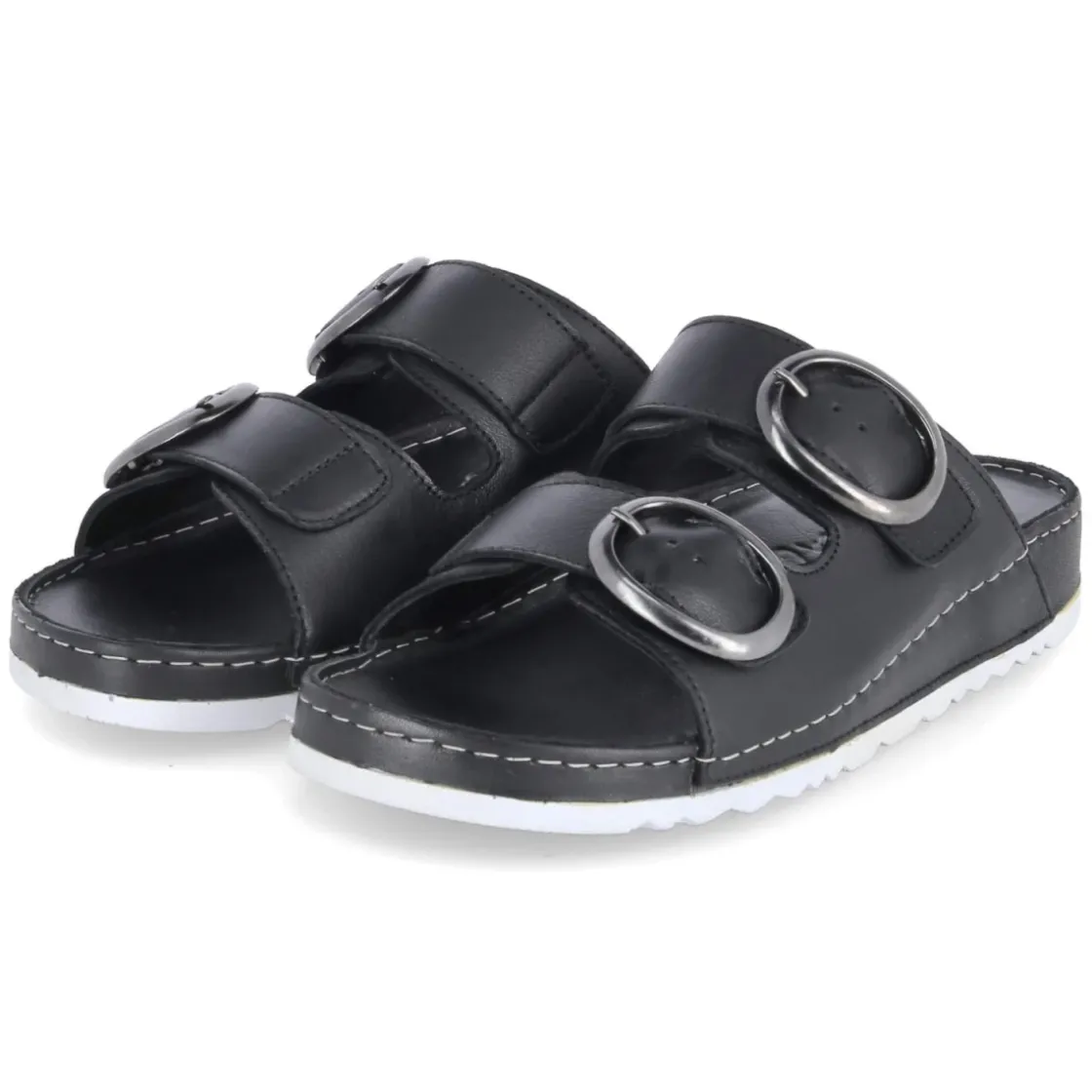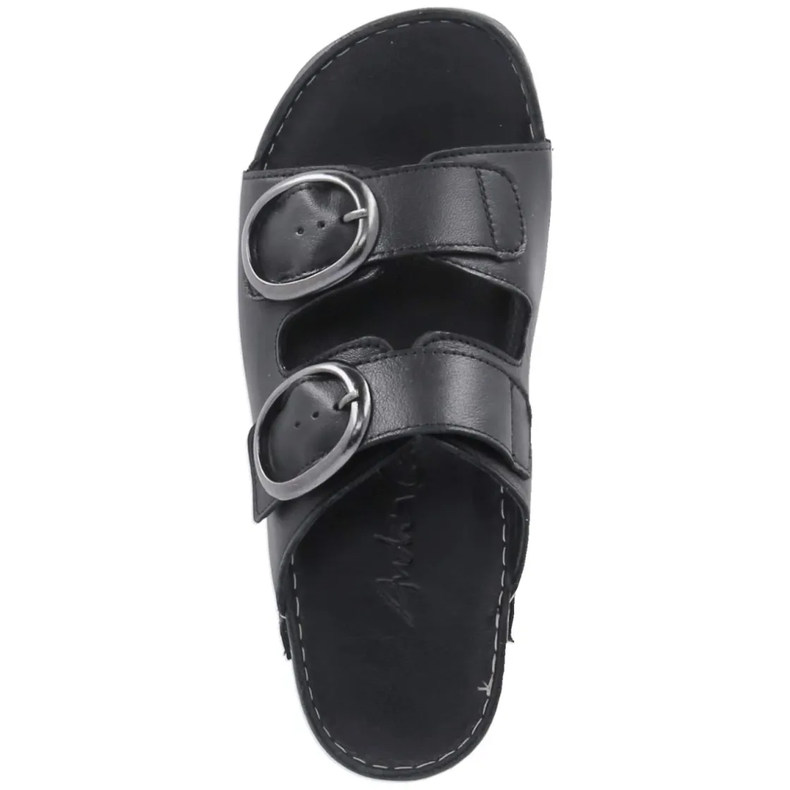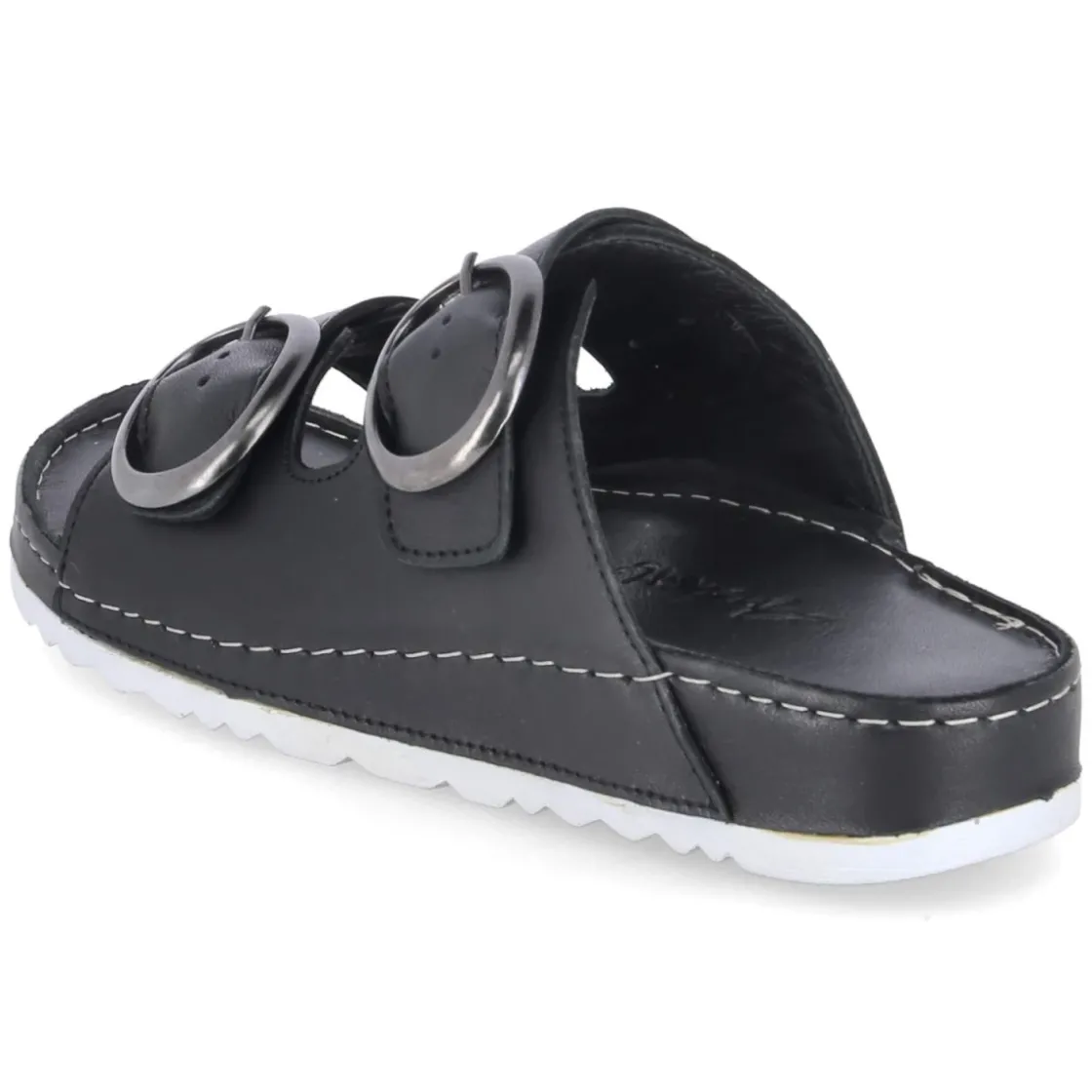 Diese Pantoletten von Andrea Conti verbinden reduziertes Design und hohen Tragekomfort. Das Obermaterial aus langlebigem Echtleder zeigt sich in zeitlosem Schwarz und wird von zwei Riemen mit Schnalle getragen, deren Elastikeinsatz sanft nachgibt und so passgenauen Halt schenkt. Die offene Zehenpartie wirkt luftig, das weiche Lederfutter und die hautfreundliche Lederdecksohle schmiegen sich angenehm an. Ein gepolstertes Lederfußbett entlastet bei jedem Schritt, während die flexible Laufsohle mit leichtem Profil für ein natürliches Abrollen sorgt. Der Schnitt fällt normal aus und macht die Wahl der gewohnten Größe unkompliziert. Modetipp: Zu luftigen Leinenhosen und einer kastigen Bluse entsteht ein moderner Sommerlook; eine schwarze Crossbody-Bag und filigraner Schmuck greifen die elegante Schlichtheit des Modells souverän auf.