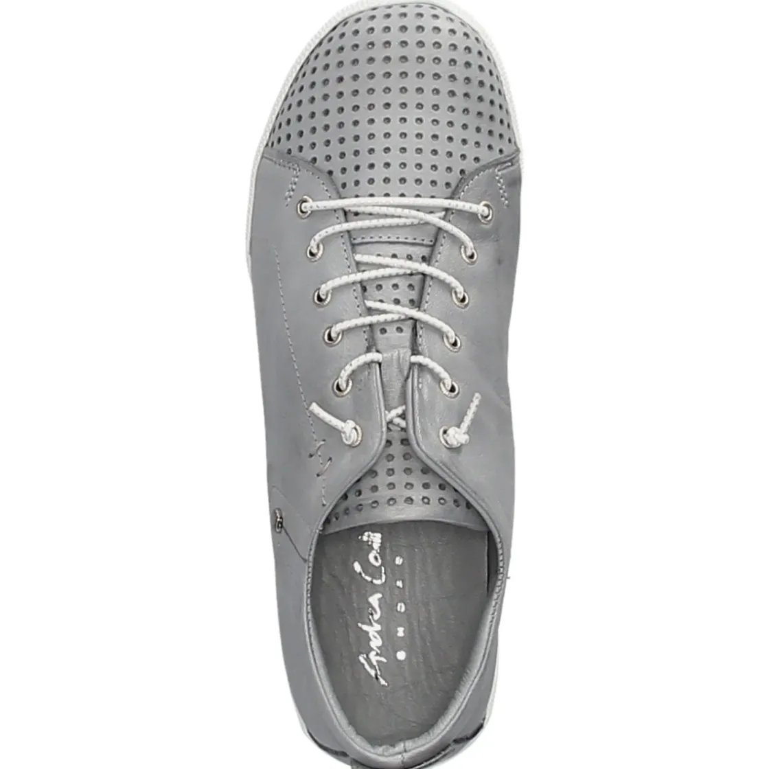 Dieser Damen-Sneaker von Andrea Conti verbindet lässigen Charme mit eleganter Optik. Weiches Rauleder in dezentem Grau und ein feines Lochstanzmuster im Vorderfuß sorgen für leichte Anmutung und angenehmes Fußklima, das Lederfutter schmeichelt der Haut. Der gepolsterte Einstieg und die gepolsterte, herausnehmbare Leder-Decksohle bieten langanhaltenden Komfort, während Zehen- und Fersenbereich verstärkt sind. Die rutschhemmende Profilsohle schenkt sicheren Halt, die runde Spitze und der Schnürverschluss stehen für klassischen Look und variable Passform. Das seitliche Dekoelement setzt einen unaufdringlichen Akzent. Fällt größengetreu aus und eignet sich als zuverlässiger Alltagsbegleiter von Büro bis Freizeit. Modetipp: Zu gekürzten Jeans und feinem Strick wirkt das Grau besonders modern; ein monochromes Outfit hebt die elegante Linienführung hervor.