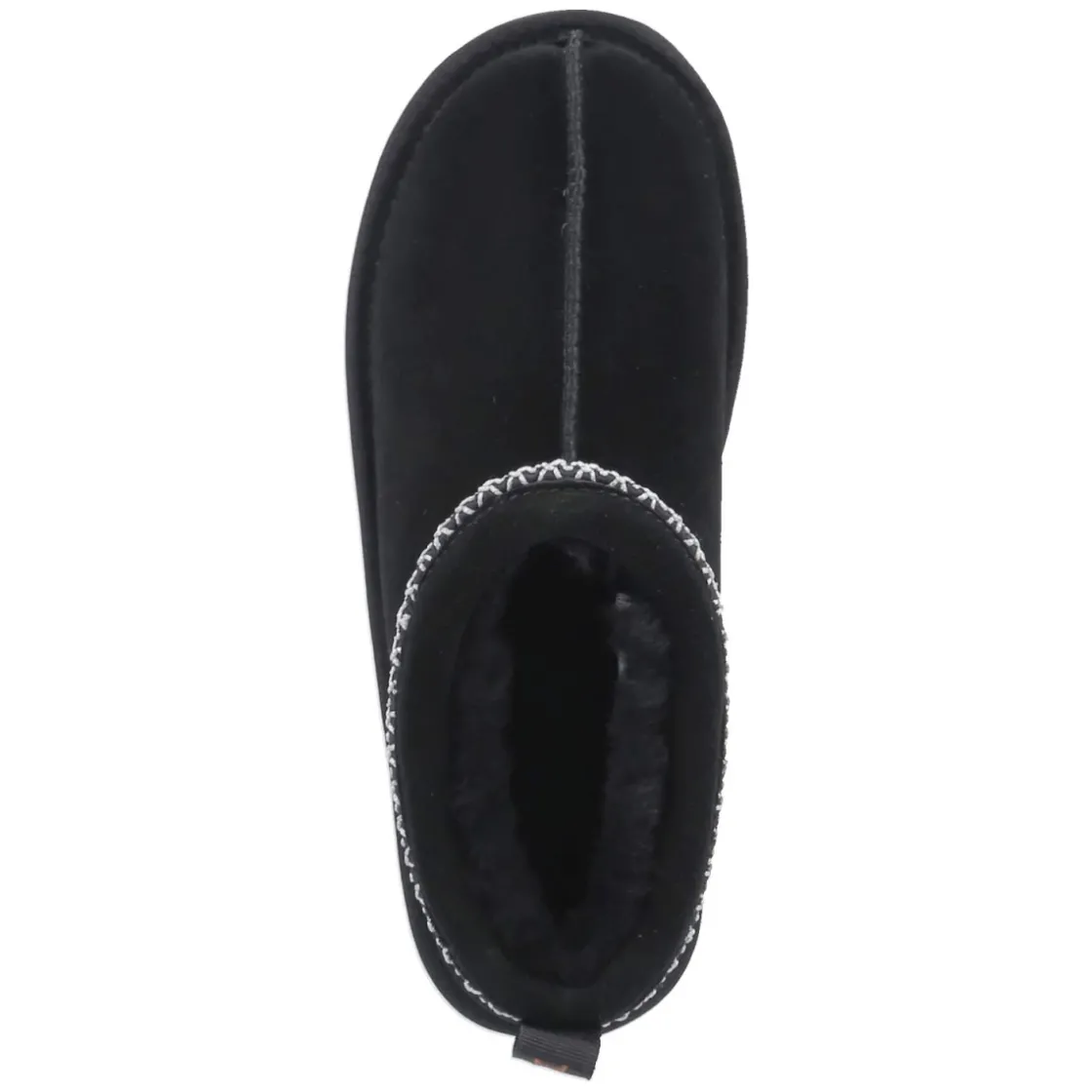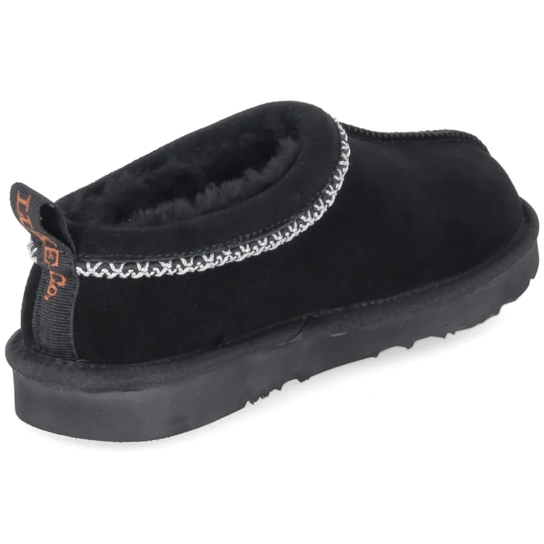 Der Slipper OUTBACK von Australia Luxe setzt auf pures Wohlbefinden und klare Formen. Weiches Rauleder in tiefem Schwarz trifft auf ein kuschelig warmes Lammfellfutter, das den Fuß umschmeichelt und behagliche Wärme spendet. Die runde Spitze und der tiefe Einstieg unterstützen das bequeme Hineinschlüpfen, während die weiße, grobe Ziernaht einen markanten Kontrast bildet. Langlebiges Echtleder und eine textile Decksohle sorgen für angenehmen Tragekomfort über viele Saisons. Das natives Design wird durch die Anziehlasche mit feiner Markenstickerei abgerundet. Fällt normal aus und ist damit unkompliziert in der Größenwahl. Modetipp: Zu geraden Denim-Silhouetten, einem weichen Wollmantel und einer Ton-in-Ton-Umhängetasche entsteht ein entspannter City-Look, der den rustikalen Charme des Slippers modern interpretiert.