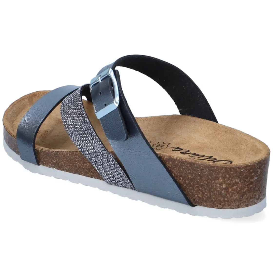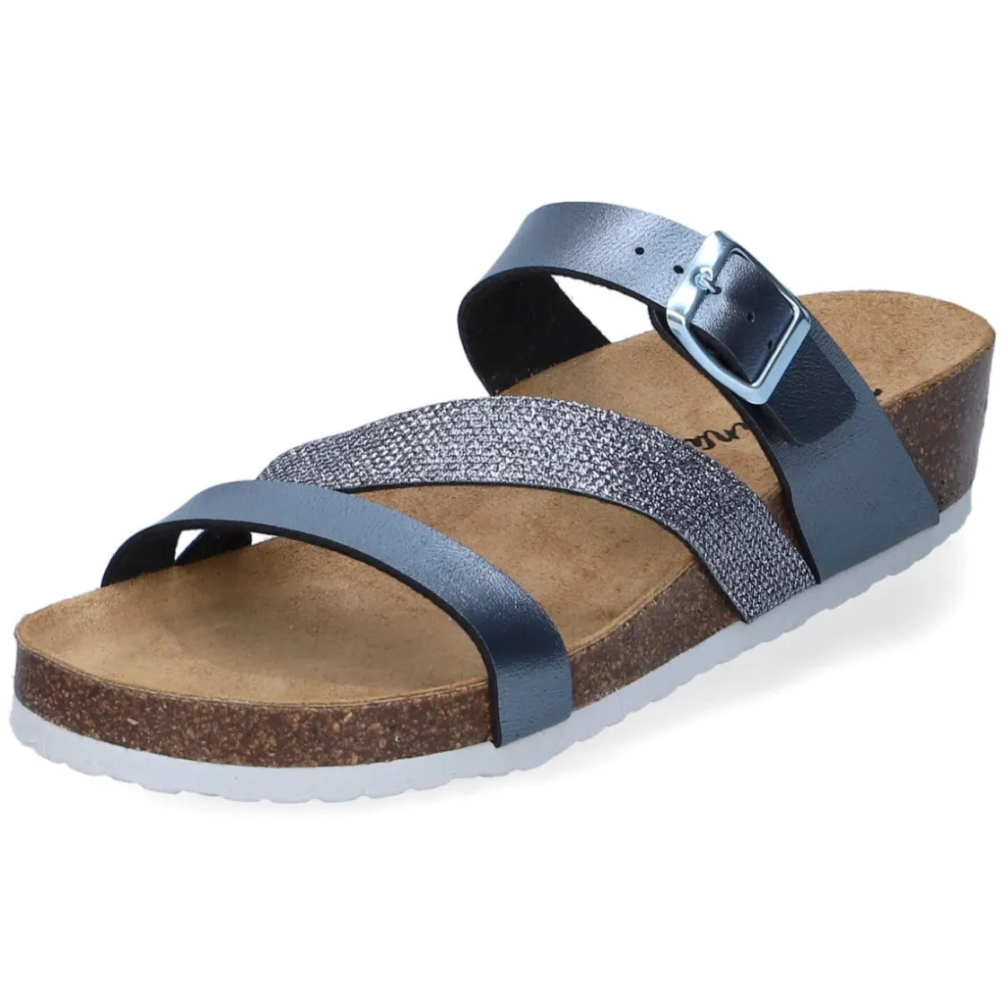 Die Beliana Pantoletten verbinden modernes Design mit lässiger Leichtigkeit. Das graue Metallic-Finish mit glitzernden Highlights verleiht jedem Look eine edle Note, während drei schmale Riemen und eine verstellbare Schnalle sicheren Halt geben. Das Obermaterial aus Kunstleder in modern designter Synthetik-Optik harmoniert mit der runden Schuhspitze und der flexiblen Profilsohle für angenehmen Grip im Alltag. Als relaxtes Leichtgewicht entlastet das Modell auf langen Wegen, das gepolsterte, vorgeformte Korkfußbett mit Lederbezug sorgt für wohltuenden Komfort. Die Passform fällt normal aus und eignet sich für vielfältige Anlässe von City bis Gartenparty. Modetipp: Ton-in-Ton mit grauen Leinenhosen und silberfarbenen Accessoires kombinieren, dazu ein fließendes Top in Eisblau für einen frischen, urbanen Sommerlook.