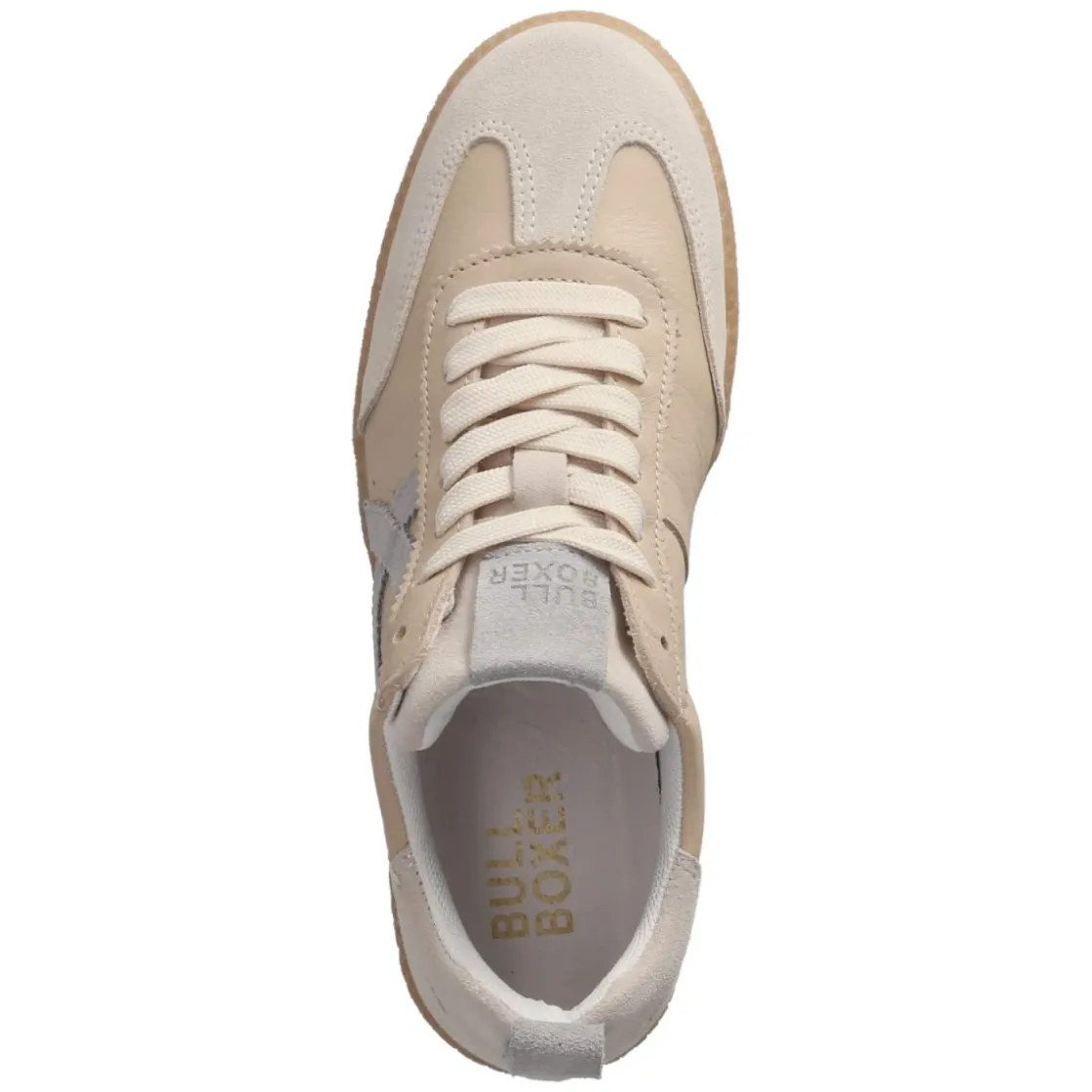 Der Low Sneaker von Bullboxer überzeugt in femininem Beige mit klarer Linienführung und einer runden Silhouette. Glattes Echtleder sorgt für ein atmungsaktives Trageklima, während hellgraue Rauleder-Verstärkungen an Zehen und Ferse den Look veredeln und zusätzlich Schutz bringen. Zwei blaue Zierstreifen setzen sportliche Akzente. Die individuell regulierbare Schnürung, ein gepolsterter Einstieg sowie die Anziehlasche erleichtern den Alltag. Ein wechselbares, hautfreundliches Fußbett unterstützt ermüdungsfreies Gehen; bei Bedarf lässt es sich durch eigene Einlagen ersetzen. Die flexible, rutschhemmende Laufsohle bietet sicheren Halt, die Passform fällt normal aus. Dezente Markendetails runden das Design ab. Modetipp: Zu Cropped-Jeans in Ecru und einem weich fallenden Stricktop entsteht ein moderner Ton-in-Ton-Look, der die blauen Streifen mit einer passenden Tasche aufgreift.