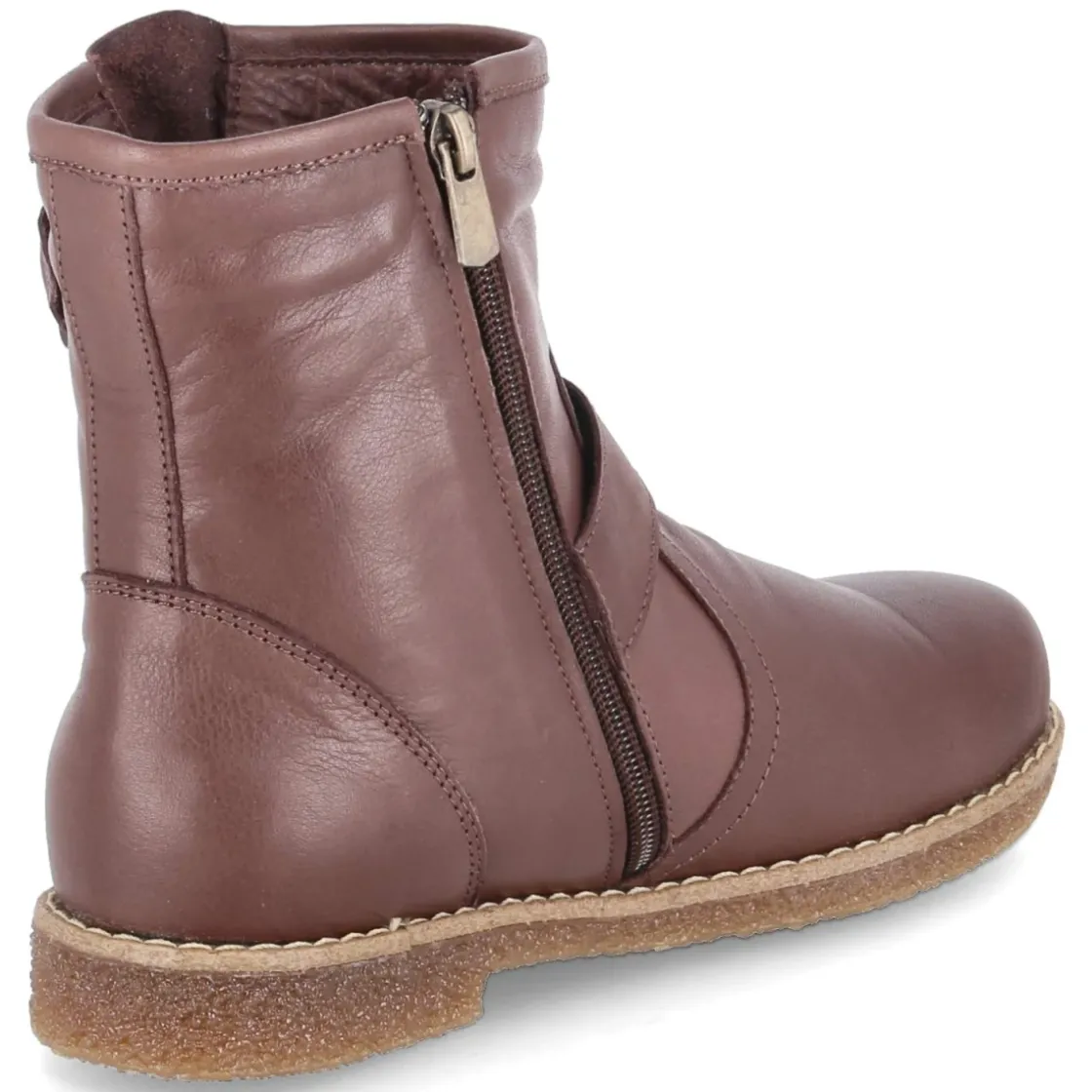 Diese Damen-Stiefeletten von Charlotte of Sweden setzen auf zeitlose Eleganz in warmem Braun und spürbaren Komfort. Feines Glattleder und eine Decksohle aus Leder umhüllen den Fuß, während das gepolsterte Wechselfußbett jeden Schritt angenehm abfedert. Die runde Spitze und der seitliche Reißverschluss sorgen für eine schmeichelnde Form und leichtes An- und Ausziehen. Zwei Riemen mit Schnallen in Kupferoptik betonen den Schaft dezent, eine verstärkte Ferse gibt Halt. Als relaxtes Leichtgewicht überzeugt das Modell im Alltag ebenso wie auf längeren Wegen, unterstützt von einer flexiblen, rutschfesten Laufsohle. Die Passform fällt normal aus, wodurch die Größenauswahl unkompliziert bleibt. Modetipp: Zu cropped Straight-Jeans, einem Feinstrickrolli und einem Wollmantel in Karamell entsteht ein harmonischer Ton-in-Ton-Look, den die kupferfarbenen Details edel abrunden.