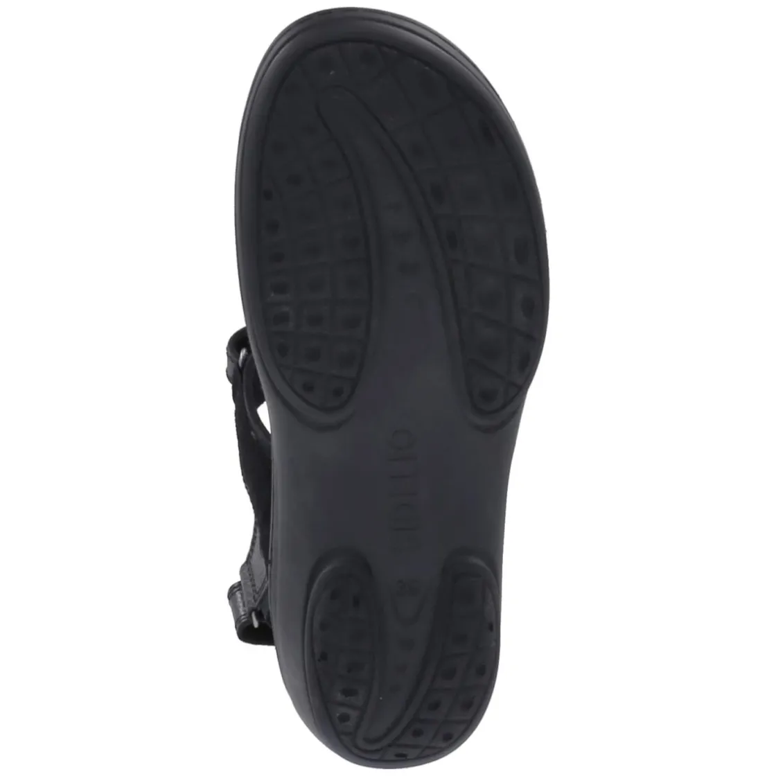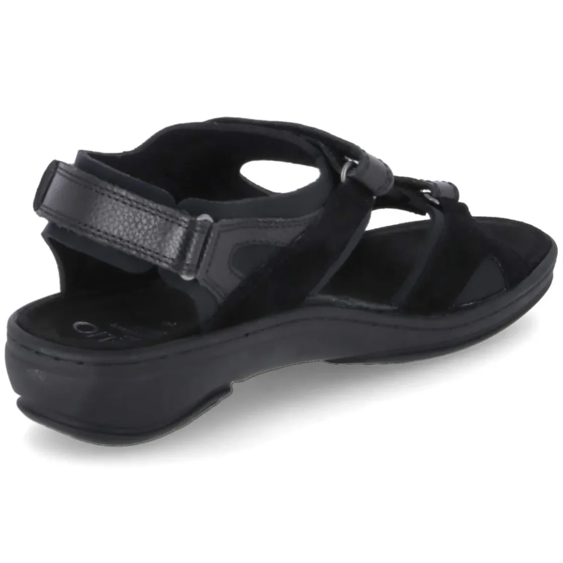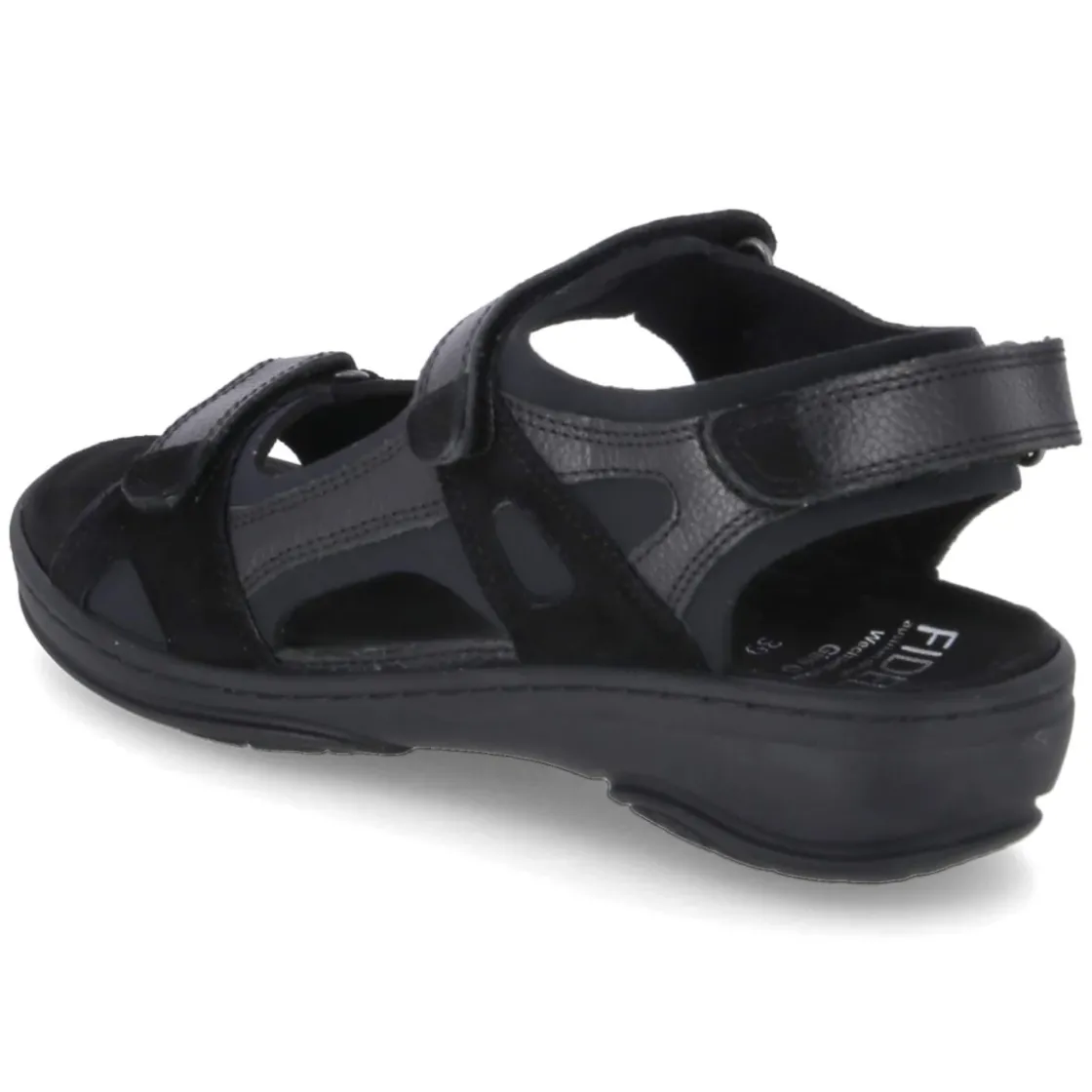 Zeitlos in Schwarz präsentiert sich die Damen-Sandale von Fidelio als verlässlicher Sommerbegleiter. Der robuste Material-Mix aus Leder und Textil sorgt für angenehme Stabilität und Flexibilität, die offene Schuhspitze und das weiche Textilfutter für ein luftig-sanftes Tragegefühl. Drei praktische Klettverschlüsse erlauben eine individuelle Anpassung, während das komfortable Wechselfußbett mit gepolsterter, herausnehmbarer Textil-Decksohle angenehm unterstützt und bei Bedarf durch eigene Einlagen ersetzt werden kann. Die flexible Laufsohle fördert natürliche Abrollbewegungen und sorgt für Trittsicherheit im Alltag. Das Modell fällt normal aus und fügt sich dank der klaren Linienführung mühelos in verschiedenste Looks ein. Modetipp: Besonders stimmig wirkt die Sandale zu monochromen Outfits mit fließender Culotte und leichter Bluse, dazu eine strukturierte Ledertasche für einen dezent eleganten Akzent.