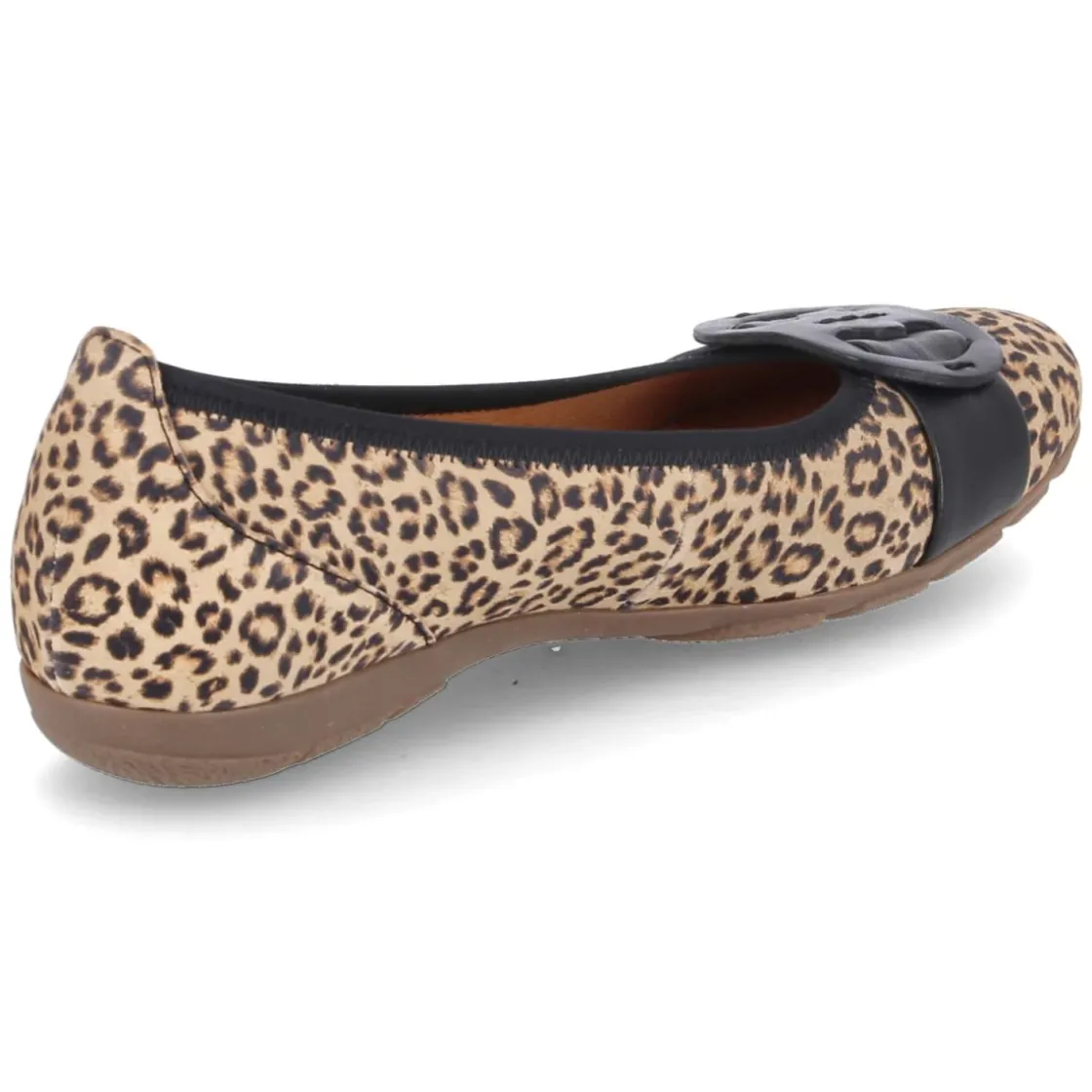 Gabor interpretiert den klassischen Ballerina mit einer eleganten, beigen Basis und markantem Animal Print in Leopard-Optik neu. Weiches Rauleder schmiegt sich an den Fuß, die runde Spitze unterstreicht die feminine Linie. Der schwarze Zierriemen mit Dekoschnalle setzt einen stilvollen Kontrast. Innen sorgt atmungsaktives Echtleder mit gepolstertem Hovercraft-Lederfußbett für spürbare Dämpfung und ein angenehmes Klima, während eine verstärkte Ferse Stabilität verleiht. Die flexible, rutschhemmende Laufsohle bietet zuverlässigen Halt im Alltag. Ohne Verschluss gestaltet, fällt das Modell normal aus und ist unkompliziert zu tragen – vom Büro bis zum Dinner. Modetipp: Besonders harmonisch zu Naturtönen wie Ecru und Sand, etwa mit Midirock und feiner Strickjacke; als Statement gelingt der Look mit schwarzer Zigarettenhose und goldfarbenen Accessoires.