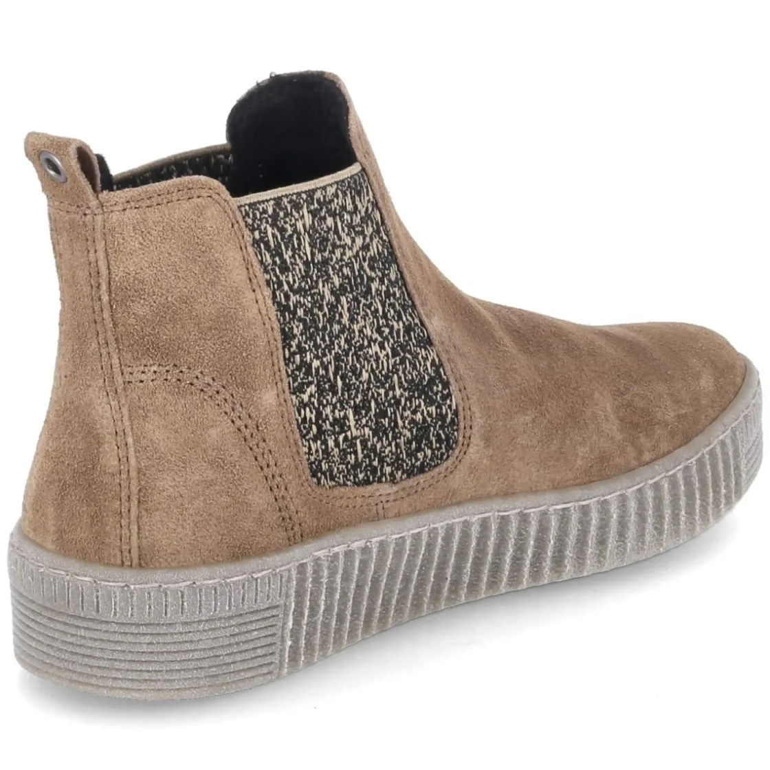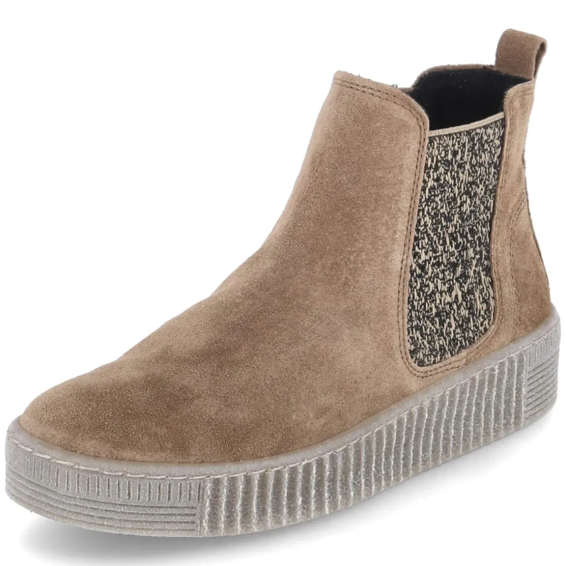 Der beige Chelsea Boot von Gabor verbindet zeitlose Linien mit durchdachtem Komfort. Weiches Rauleder legt sich edel um den Fuß, die melierten seitlichen Elastikeinsätze sorgen für eine anschmiegsame Passform und erleichtern den schlupffreundlichen Einstieg. Eine runde Spitze bietet Zehenfreiheit, die verstärkte Ferse Stabilität. Innen liegt eine Textil-Decksohle auf einem herausnehmbaren Wechselfußbett, ideal für individuelle Einlagen. Die vernähte Cupsohle zeigt Flexibilität und bietet dank griffigem Profil sicheren Halt im Alltag. Das Modell fällt größengetreu aus und begleitet Erwachsene durch Stadt und Büro mit lässiger Eleganz. Modetipp: Besonders stimmig zu knöchellangen Straight-Jeans und einem Camel-Coat oder zu einem Feinstrickkleid mit blickdichten Strümpfen.