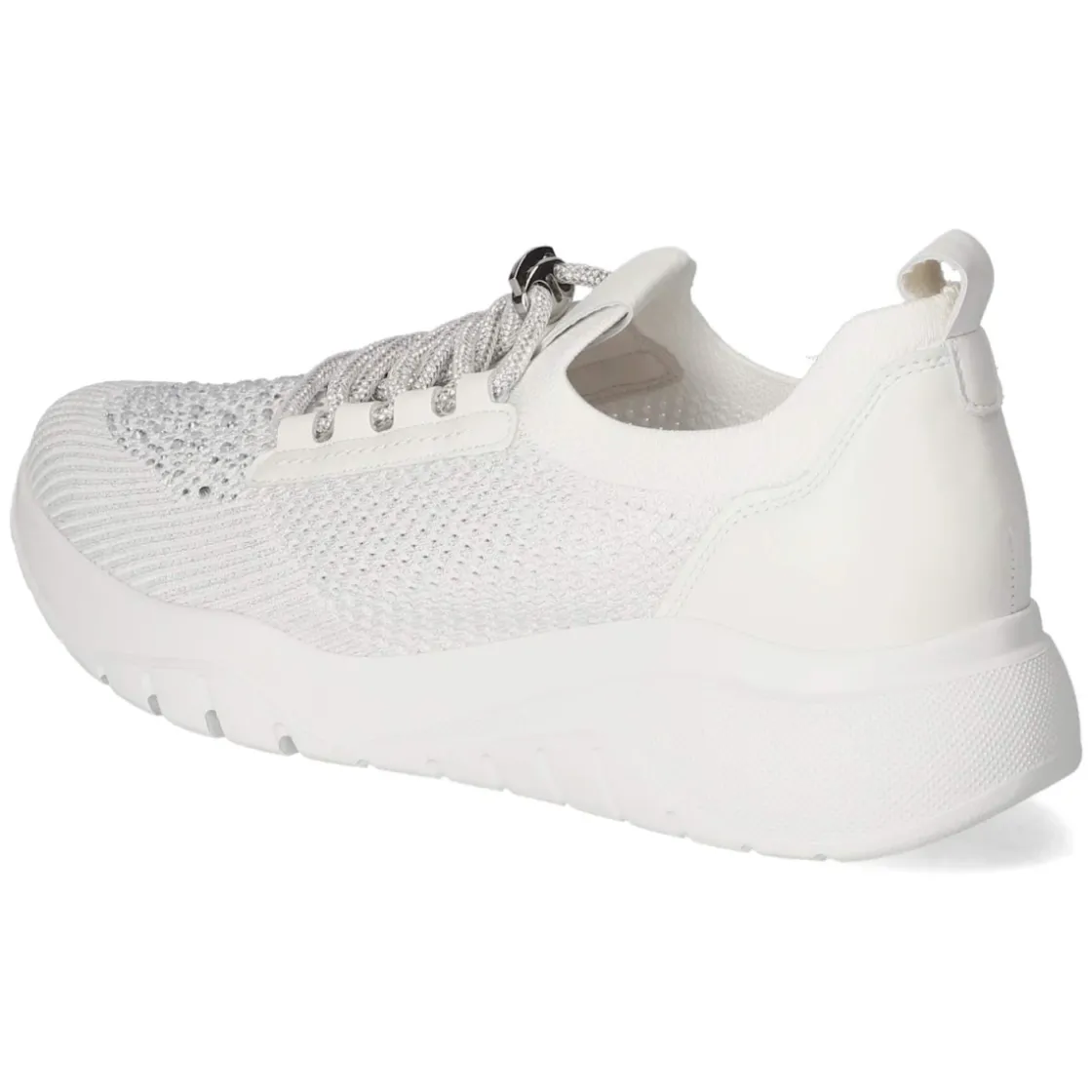 Der weiße Low Sneaker von Gabor verbindet sportliche Leichtigkeit mit edler Optik. Ein Mix aus weichem Leder und leichtem Textil mit Mesh-Parts sorgt für atmungsaktive Bequemlichkeit, die runde Schuhspitze unterstreicht den modernen Look. Silberfarbene Schmucksteine und ein subtiler Schimmer setzen dezente Highlights. Der Schnellverschluss mit Anziehlasche und leichter Stretcheinstieg ermöglichen ein rasches Hineinschlüpfen. Innen bietet die lederne Decksohle ein angenehmes Fußklima, das gepolsterte Wechselfußbett steigert den Komfort zusätzlich und kann gegen eigene Einlagen getauscht werden. Die flexible Laufsohle fördert ein geschmeidiges Abrollen. Fällt normal aus und eignet sich damit für die gewohnte Größe. Modetipp: Besonders stimmig zu monochromen Outfits in Creme und Off-White oder zu feinen Jogpants aus Strick, dazu eine strukturierte Crossbody-Bag – so entsteht ein eleganter Athleisure-Look.