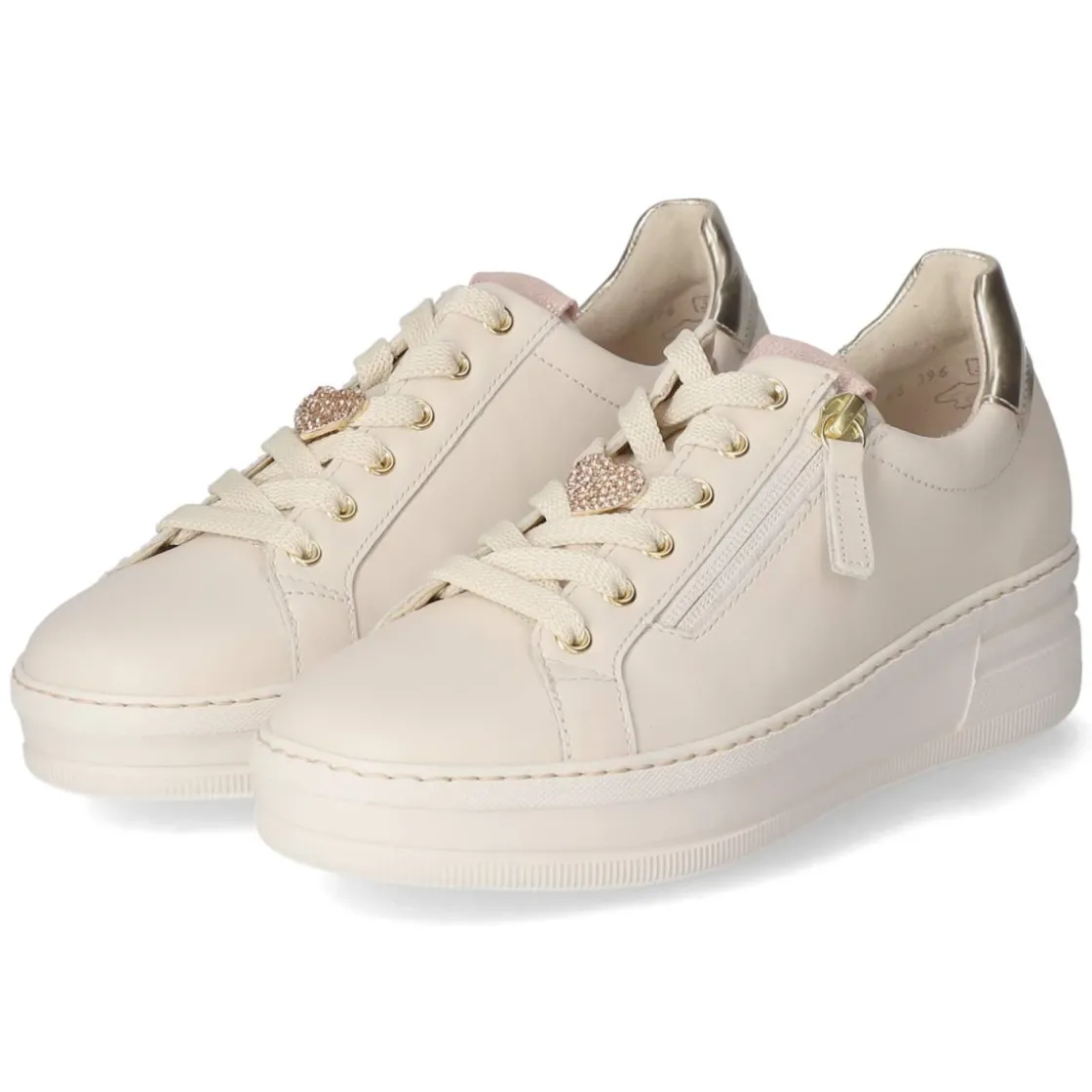 Der Low Sneaker von Gabor zeigt sich in elegantem Beige und vereint komfortorientiertes Design mit feiner Detailverliebtheit. Glattleder als Obermaterial sorgt für langlebige Qualität, während die runde Schuhspitze und der gepolsterte Einstieg ein angenehmes Tragegefühl unterstützen. Praktisch und schick zugleich: die Kombination aus Schnürsenkeln und zusätzlichem Reißverschluss für schnelles An- und Ausziehen. Ein herausnehmbares, weich gepolstertes Wechselfußbett und eine Textil-Decksohle erhöhen den Komfort im Alltag. Goldfarbene Akzente und ein herzförmiger Schmuckanhänger setzen dezente Highlights, die flexible, rutschhemmende Laufsohle bietet sicheren Halt. Der Schuh fällt normal aus und eignet sich ideal für Damen, die zeitlose Vielseitigkeit schätzen. Modetipp: Zu hellen Chinohosen und einem cremefarbenen Stricktop entsteht ein harmonischer Ton-in-Ton-Look, abgerundet mit filigranem Goldschmuck.