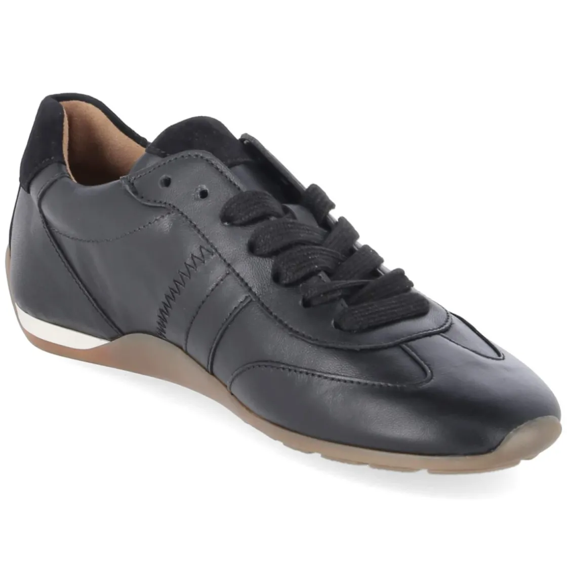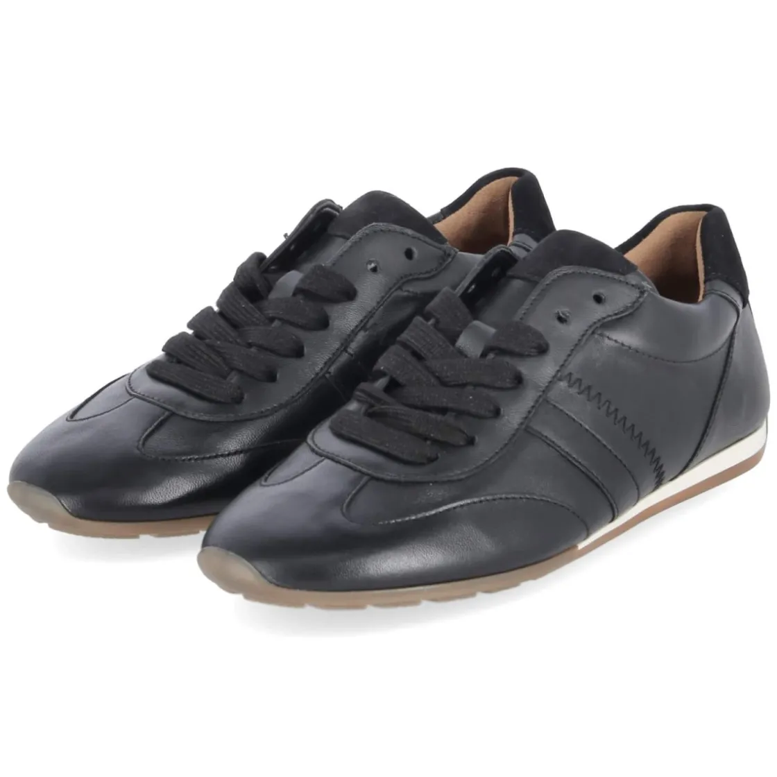 Dieser Low Sneaker von Gabor setzt auf reduziertes Design und hochwertige Materialien: schwarzes Glattleder mit dezenten, seitlichen Zierstreifen trifft auf eine hautfreundliche Lederdecksohle und ein praktisches Wechselfußbett. Die runde Spitze und die klassische Schnürung sorgen für zeitlosen Komfort, während der leicht gepolsterte Einstieg sowie der verstärkte Fersen- und Zehenbereich angenehm Halt geben. Eine dünne, flexible und rutschhemmende Laufsohle macht das relaxt leichte Modell zum verlässlichen Alltagsbegleiter. Fällt normal aus und lässt sich zu vielen Looks kombinieren – von smart bis casual. Modetipp: Besonders stimmig zu einer schmalen Anzughose in Anthrazit, weißem Popelinhemd und einem kurzen Trench; alternativ zu einem Midirock aus Satin und Feinstrick.