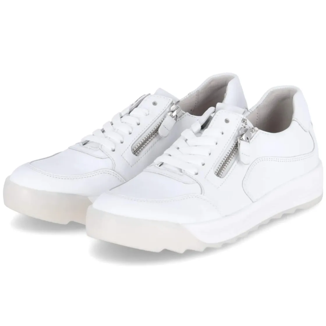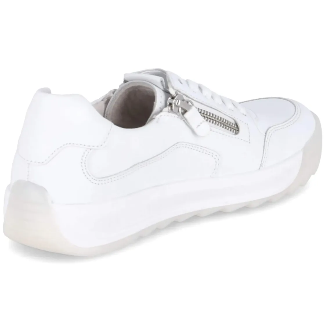 Der Gabor Low Sneaker in strahlendem Weiß verbindet urbanen Minimalismus mit durchdachtem Komfort. Langlebiges Echtleder in feinem Glattleder sorgt für eine wertige Optik, die runde Schuhspitze und der leicht gepolsterte Einstieg unterstützen entspanntes Gehen. Schnürung und zwei Reißverschlüsse ermöglichen variablen Halt und ein schnelles Hineinschlüpfen, der verstärkte Zehen- und Fersenbereich erhöht die Robustheit. Ein herausnehmbares, weich gepolstertes Wechselfußbett aus recycelten Materialien bietet angenehme Dämpfung und macht den Sneaker zugleich umweltfreundlich und nachhaltig. Die flexible, rutschhemmende Laufsohle gibt sicheren Grip im Alltag, dezentes Branding setzt einen feinen Akzent. Die Passform fällt normal aus, eine Decksohle aus Leder rundet das Tragegefühl ab. Modetipp: Zu cropped Denim und cleanem Trench wirkt das Weiß besonders modern.