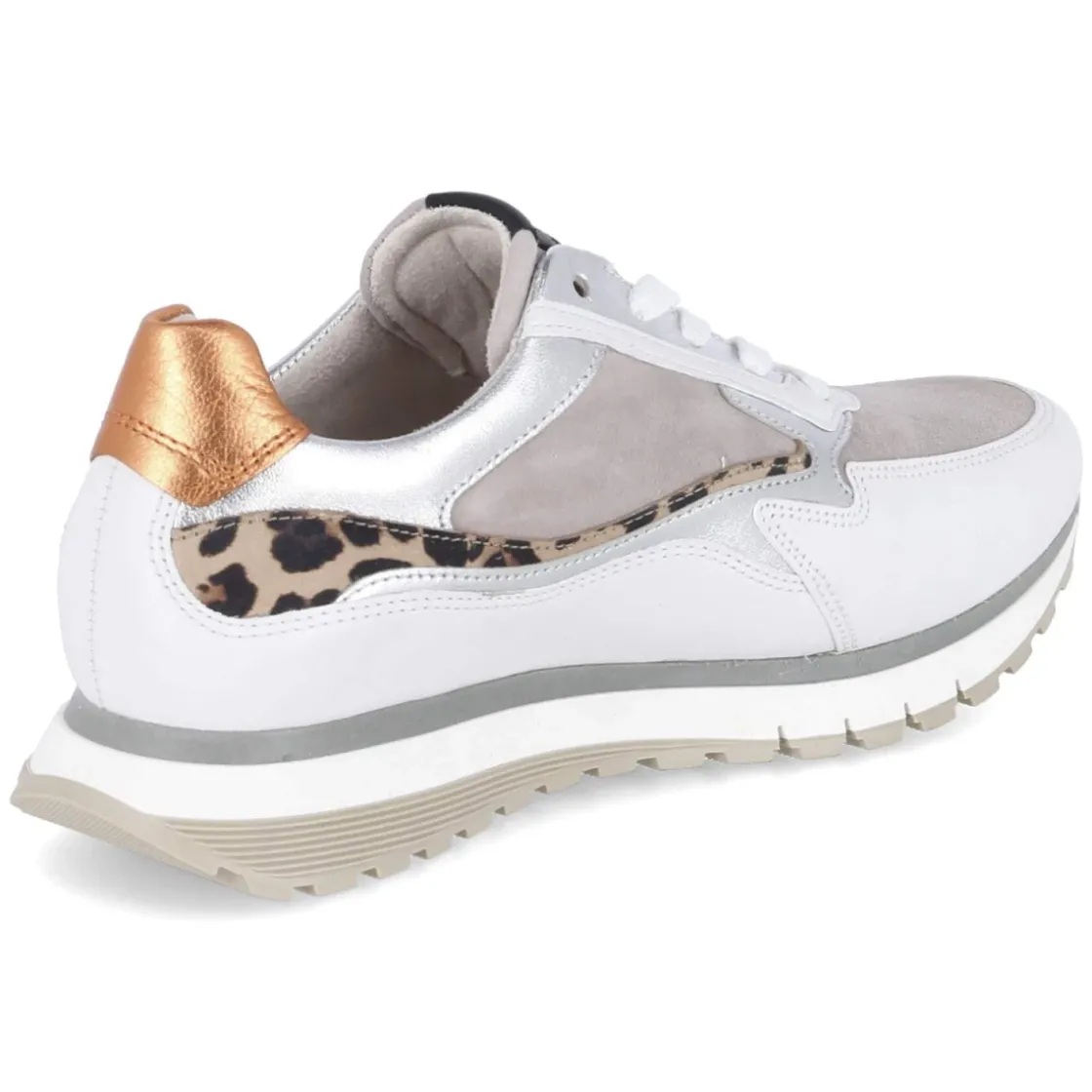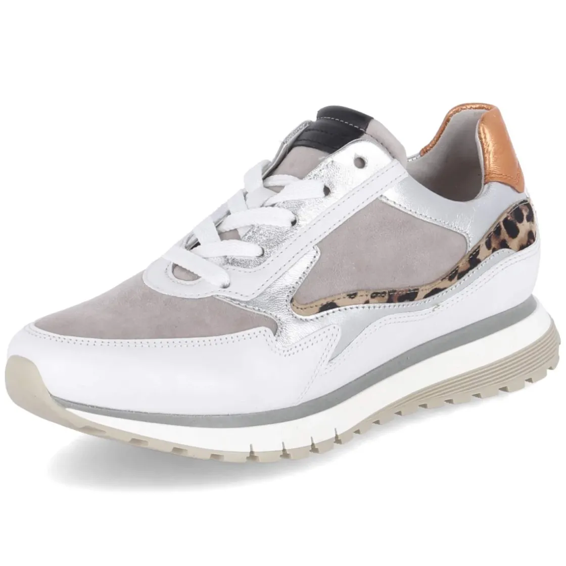 Der Low Sneaker von Gabor verknüpft puristische Linien mit durchdachter Funktion. Das weiße Obermaterial aus langlebigem Echtleder zeigt sich weich und formstabil, die runde Spitze ergänzt die zeitlose Silhouette. Ein gepolsterter Einstieg und ein komfortables, herausnehmbares Fußbett sorgen für angenehme Dämpfung, während der verstärkte Zehen- und Fersenbereich zusätzliche Stabilität bringt. Dezente Label-Details treffen auf Zierstreifen in Silber und Leopardenmuster, die der modernen Optik einen subtilen Twist verleihen. Dank rutschhemmender Laufsohle bleibt der Auftritt sicher, die Passform fällt normal aus und lässt Raum für eigene Einlagen. Klassische Schnürung ermöglicht präzisen Halt von morgens bis abends. Modetipp: Den cleanen Look mit Cropped-Jeans, weißem T‑Shirt und einem leichten Trench kombinieren; ein Accessoire mit Animal-Detail greift den Streifen elegant auf.