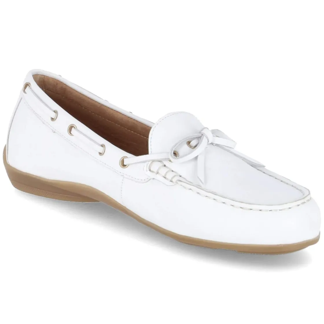 Gabor Mokassins in klassischem Weiß verbinden zeitlose Eleganz mit durchdachtem Komfort. Das hochwertige Glattleder zeigt eine feine Narbung und überzeugt als langlebiges Echtleder, während die rund zulaufende Spitze dem Damenmodell eine sanfte Linienführung gibt. Ohne Verschluss gestaltet sich der Einstieg unkompliziert, unterstützt von der zierenden, umlaufenden Schnürung und der charakteristischen Wulstnaht, die den Mokassin-Look akzentuiert. Ein hautfreundliches Lederfutter und die gepolsterte Lederdecksohle sorgen für ein angenehmes Fußklima, der verstärkte Fersenbereich für Formstabilität. Die flexible, rutschhemmende Laufsohle mit leichtem Profil gibt Halt auf glatten Böden. Das Modell für Erwachsene fällt normal aus und begleitet souverän Business- und Freizeit-Outfits. Modetipp: Zu weißem Glattleder harmonieren Leinentöne und sanfte Pastells; etwa zu einer cremefarbenen Culotte und einer seidig schimmernden Bluse.