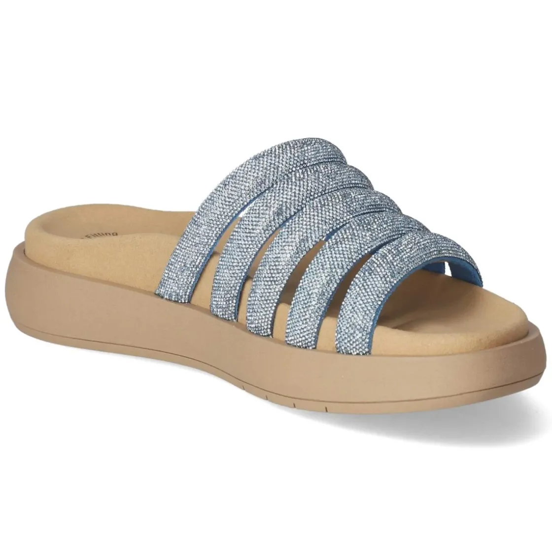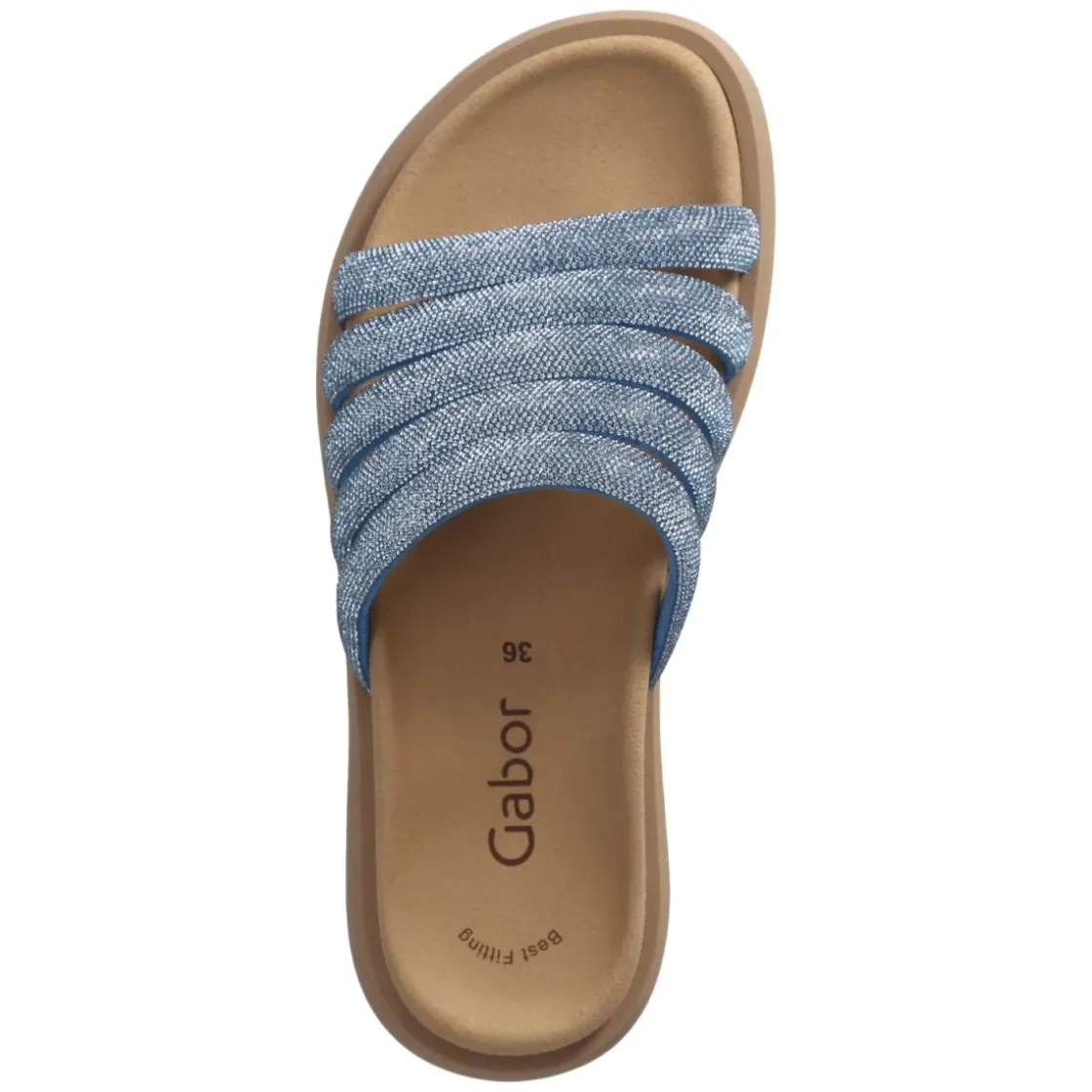 Diese blauen Pantoletten von Gabor verbinden edle Optik mit unkompliziertem Tragekomfort. Das synthetische Obermaterial zeigt eine glitzernde Oberfläche, die von dezent gesetzten Schmucksteinen akzentuiert wird und Sommerlooks ein funkelndes Finish verleiht. Die offene Schuhspitze und der Verzicht auf einen Verschluss sorgen für schnelles Hineinschlüpfen, während die textilbezogene, vorgeformte Decksohle und das vorgeformte, gepolsterte Fußbett den Fuß angenehm unterstützen. Eine flexible, rutschhemmende Laufsohle bietet sicheren Halt auf glatten Böden. Die Passform fällt normal aus und eignet sich für den täglichen Einsatz in Stadt und Urlaub. Modetipp: Zu fließenden Midi-Kleidern oder hellen Culottes und einer Perlen- oder Silbertasche entsteht ein eleganter, sommerlicher Auftritt.