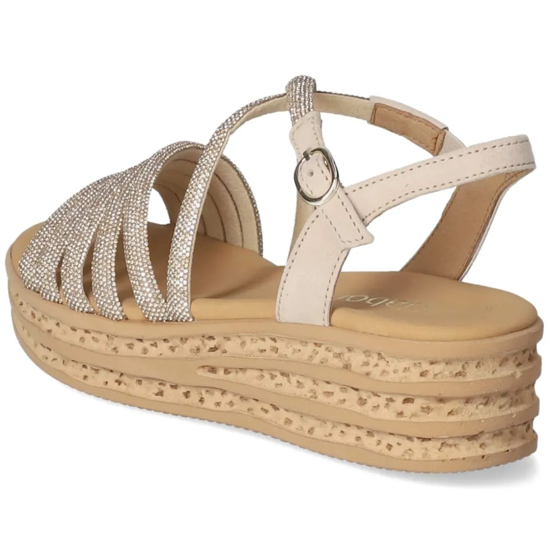 Gabor interpretiert die Plateau-Sandalette in Gold mit modernem Glamour und komfortabler Ausstattung. Das Obermaterial aus weichem Rauleder mit glitzernder Oberfläche wirkt edel, während elegante Riemen mit funkelnden Schmucksteinen das Licht einfangen. Eine goldfarbene Schnalle mit zwei Elastikeinsätzen erleichtert das An- und Ausziehen und sorgt für flexible Anpassung. Die offene Schuhspitze verleiht sommerliche Leichtigkeit. Für Tragekomfort steht das gepolsterte, hautfreundliche Lederfußbett, ergänzt durch einen leichten Keil und 5 cm Absatzhöhe, der stabilen Halt mit sanfter Höhe kombiniert. Der Fit fällt normal aus und macht die Sandaletten zum zuverlässigen Begleiter für Events und City-Looks. Modetipp: Zu cremefarbener Culotte und Seidentop entsteht ein elegant-lässiges Ensemble mit harmonischem Goldakzent.