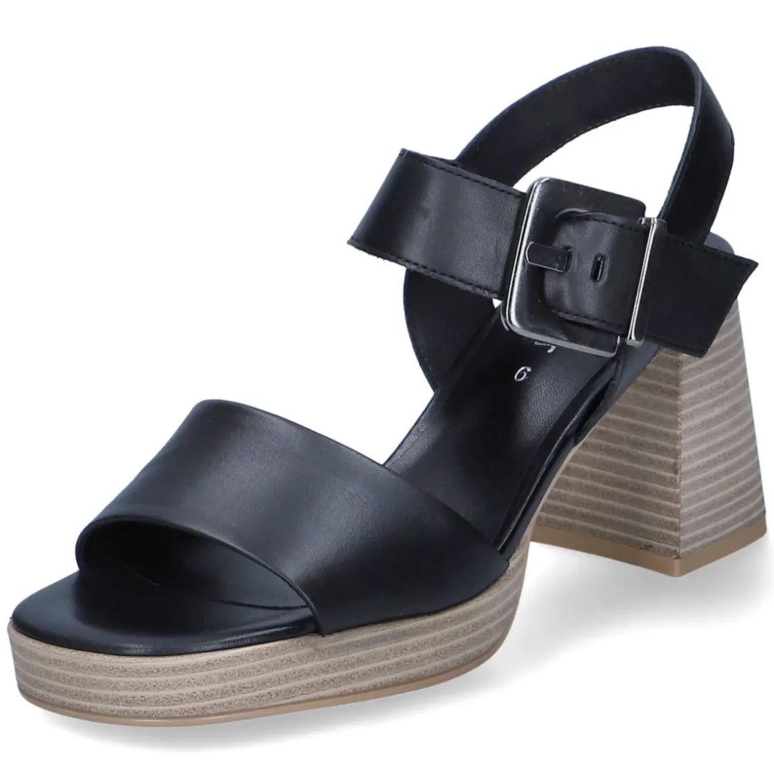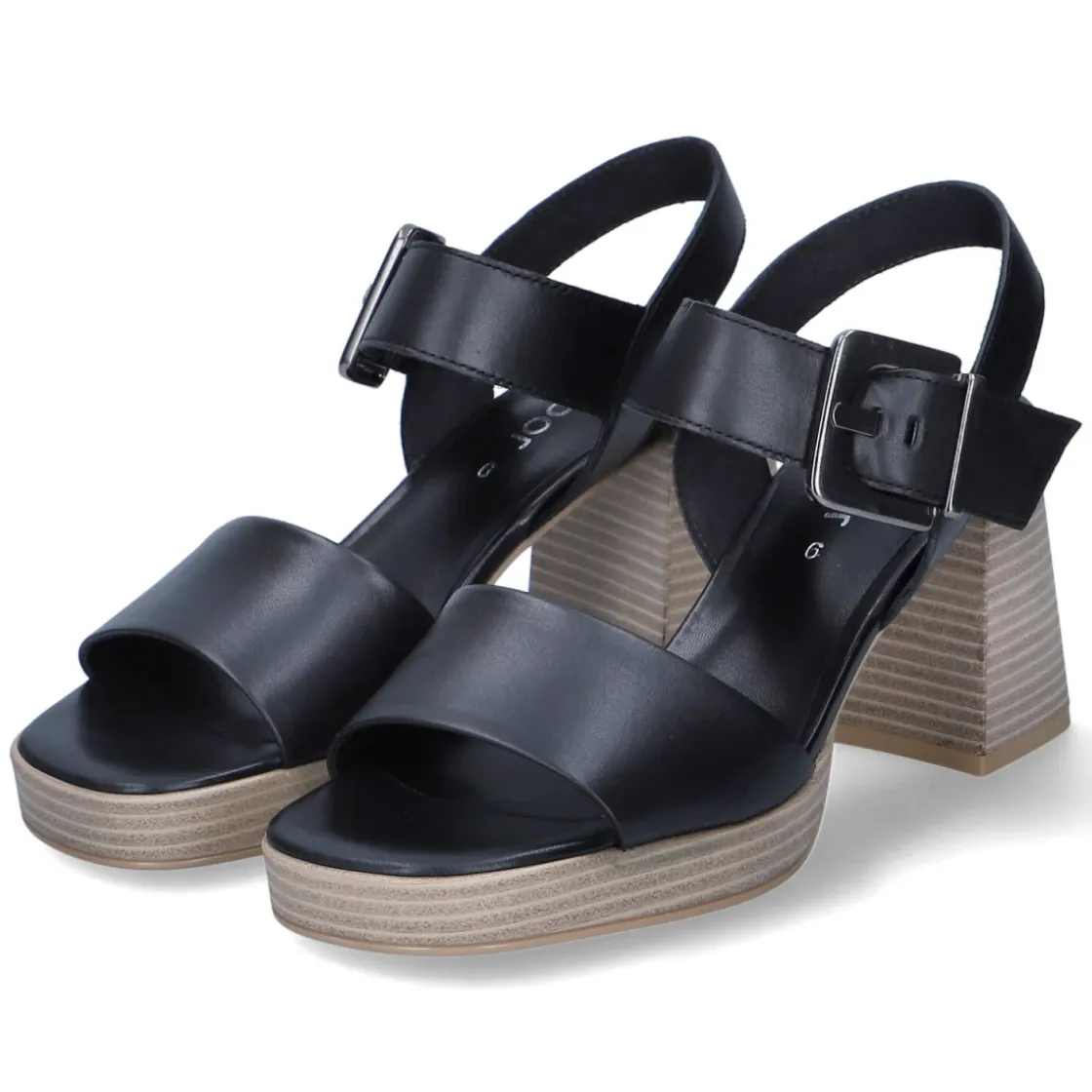 Elegante Sandaletten von Gabor, die mit schwarzem Glattleder und einem markanten Blockabsatz in Holzoptik überzeugen. Das langlebige Echtleder schmiegt sich angenehm an, während die lederne Decksohle für ein natürliches Fußklima sorgt. Ein gepolstertes Fußbett federt jeden Schritt ab und macht auch längere Anlässe komfortabel. Die offene Schuhspitze verleiht sommerliche Leichtigkeit, die sichere Schnalle sorgt für stabilen Halt. Mit 8 cm Absatz strecken sie die Silhouette, bleiben dank Blockform jedoch angenehm standfest. Die Passform fällt normal aus und eignet sich ideal für vielfältige Outfits vom Business-Look bis zum Abendstyle. Modetipp: Zu einer fließenden Culotte und einem ärmellosen Top kombinieren und mit zartem Goldschmuck den edlen Ton des Holzabsatzes aufnehmen.