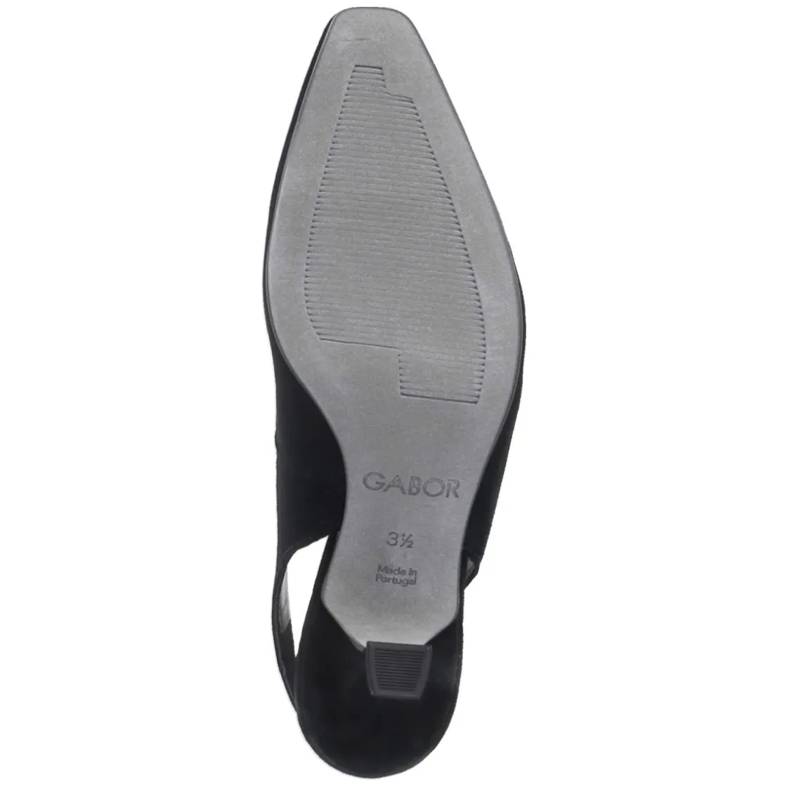 Dieser Slingpumps von Gabor zeigt, wie moderne Klarheit und Komfort harmonieren. Das Obermaterial aus samtigem Rauleder in tiefem Schwarz legt sich weich an und wird von einer markanten Karree-Spitze akzentuiert, die dem Schuh eine zeitgemäße Kontur verleiht. Ein 6 cm hoher Trichterabsatz mit feiner Sanduhrenanmutung sorgt für eleganten Stand und feminine Proportionen, während das hautfreundliche Lederfutter und die lederne Decksohle ein angenehm natürliches Fußklima schaffen. Die flexible Laufsohle unterstützt einen geschmeidigen Abrollvorgang, die verstellbare Schnalle mit Elastikeinsatz bietet variablen Halt. Größengetreu ausfallend, begleitet dieses Modell souverän vom Office zum Dinner. Modetipp: Zu einem Midirock aus Satin und einem strukturierten Blazer entsteht ein souveräner Monochrom-Look; alternativ verleiht der Pumps Wide-Leg-Jeans und feinem Strick mühelos urbane Eleganz.