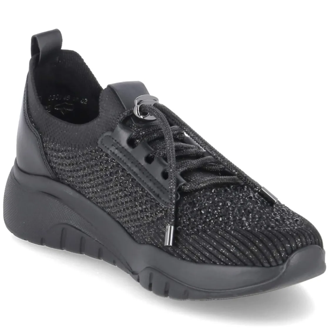 Glamour trifft Komfort: Der schwarze Gabor Sneaker verbindet eine elegant schimmernde Oberfläche mit glitzerndem Mesh in Strickoptik und schafft so ein edles, sportives Erscheinungsbild. Das Obermaterial aus Leder und Textil sorgt für wertige Haptik, der stretchige Einstieg erleichtert das Anziehen, während verstärkter Zehen- und Fersenbereich zusätzliche Formstabilität geben. Ein rundes Leistenbild und die flexiblen, rutschhemmenden Laufsohlen bieten entspanntes Abrollen im Alltag. Das weich gepolsterte Wechselfußbett mit Lederbezug verwöhnt, kann bei Bedarf jedoch durch eigene Einlagen ersetzt werden. Fällt weiter aus und punktet damit mit angenehmer Weite. Zierende Schnürung und dezentes Branding runden das glamouröse Design ab. Modetipp: Für einen modernen City-Look mit Straight-Leg-Jeans, edlem Blazer und feinem Stricktop kombinieren; für Abend-Glow passt ein satinierter Midirock in Dunkelnuancen.