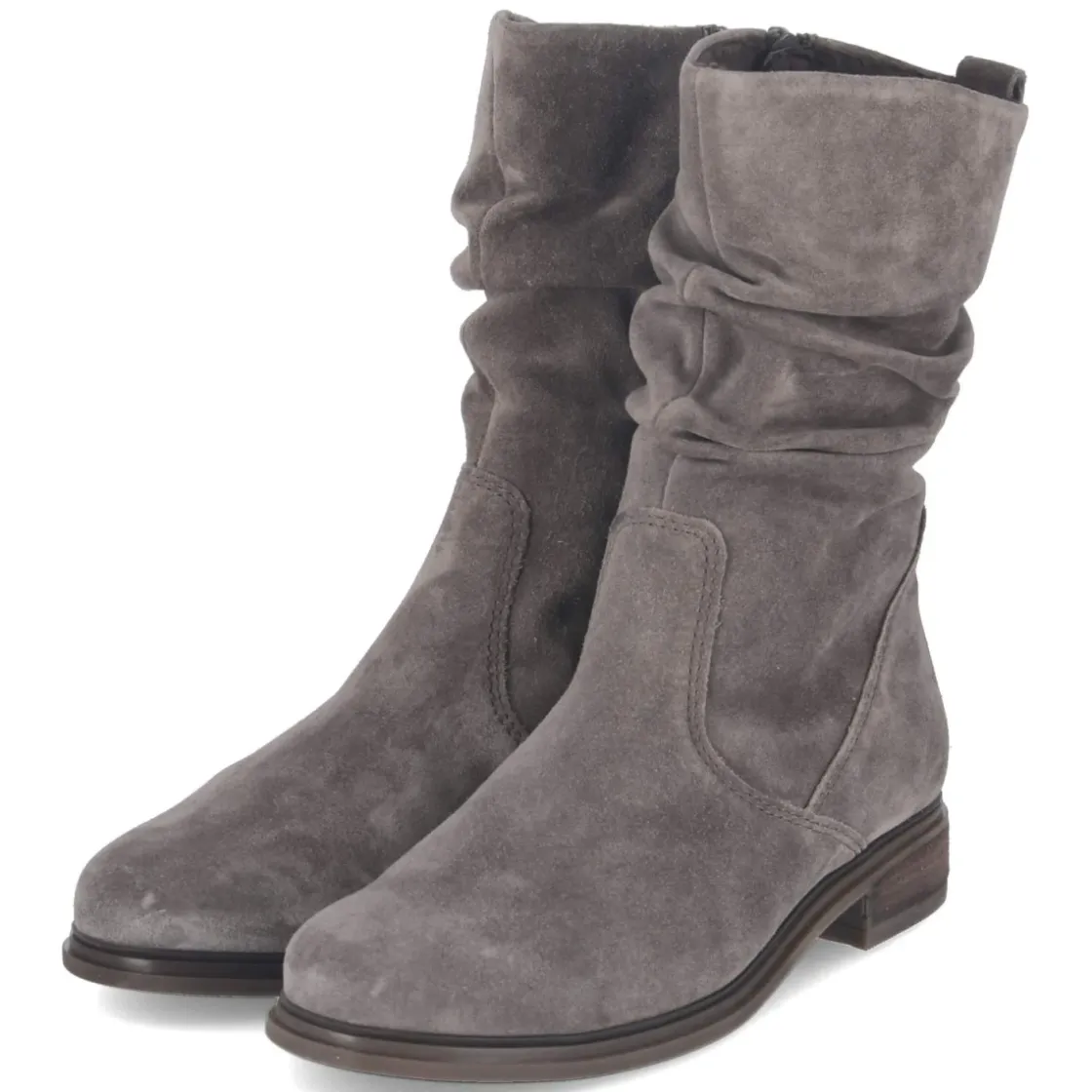 Die Gabor Stiefeletten vereinen zeitlose Eleganz und Wohlfühlkomfort. Das hochwertige Rauleder in Taupe zeigt eine dezent samtige Oberfläche, die jedem Look Ruhe und Wertigkeit verleiht. Ein 3 cm hoher Blockabsatz sorgt für stabilen Stand, während die runde Schuhspitze angenehm Platz bietet. Der Reißverschluss erleichtert den Einstieg, unterstützt von Anziehlasche und gerafftem, weichem Schaft. Innen sorgt ein leichtes Futter für behagliche Wärme an kühlen Tagen, die textile Decksohle und das gepolsterte Wechselfußbett steigern den Tragekomfort spürbar. Die flexible, rutschfeste Laufsohle begleitet zuverlässig durch den Alltag. Passformhinweis: fällt normal aus. Modetipp: Ton-in-Ton mit Wollmantel in Greige und Cropped-Jeans stylen, dazu feine Stricksocken leicht sichtbar tragen – so kommt die nuancierte Taupe-Farbe modern und mühelos zur Geltung.