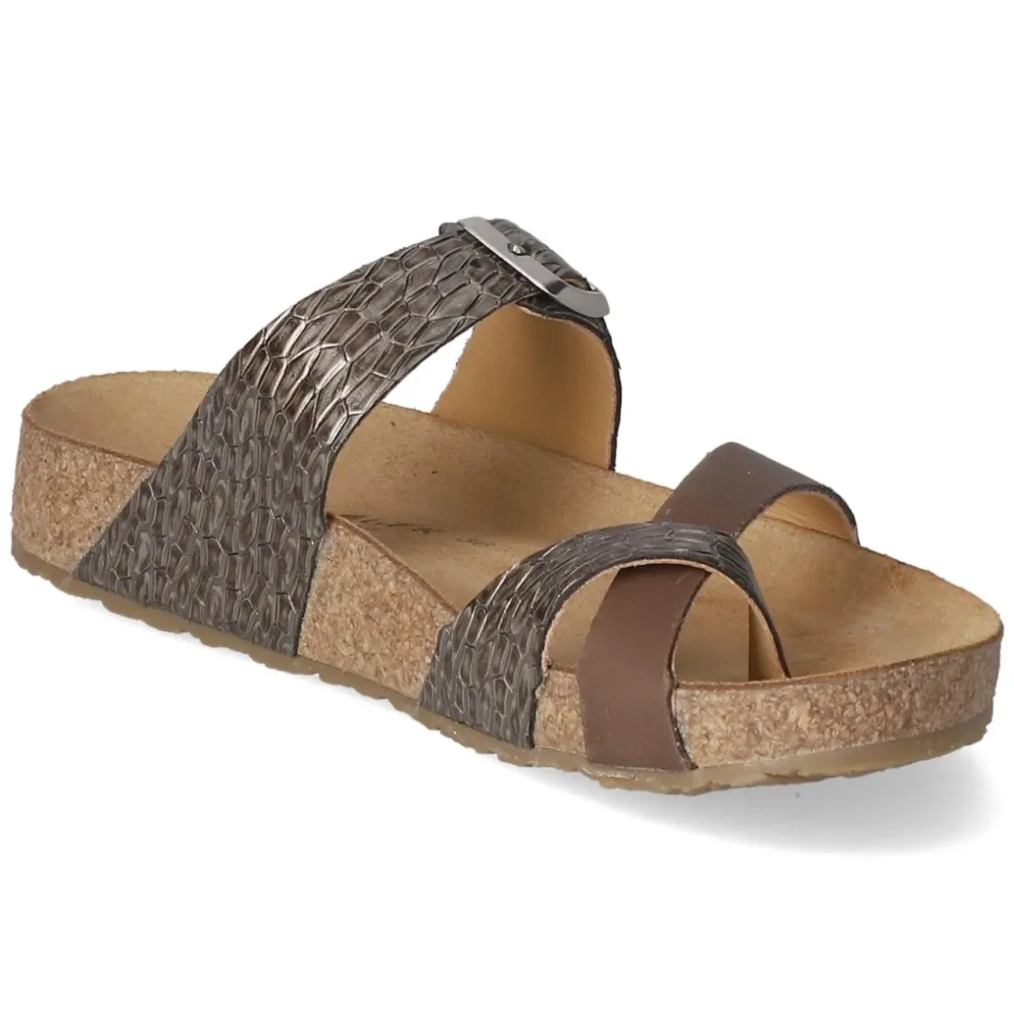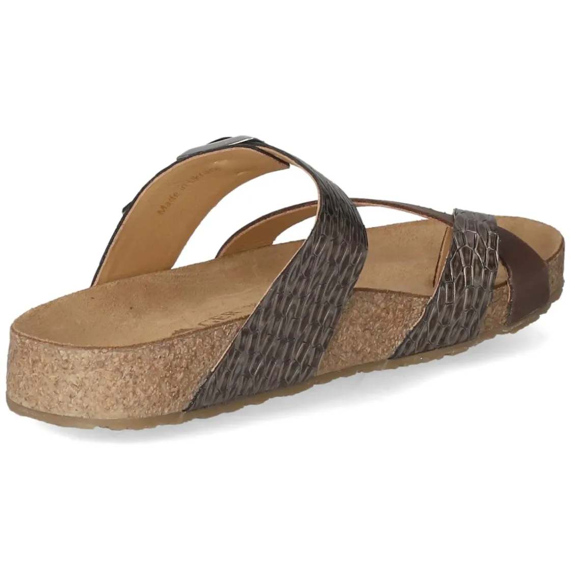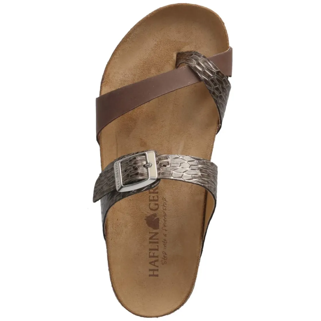 Der Zehentrenner JUNO von Haflinger setzt auf zeitlose Eleganz in Braun mit reptilinspirierter Prägung und dezent schimmerndem, metallischem Effekt in Braun-Grau. Glattes, atmungsaktives Echtleder umschließt den Fuß angenehm, während die offene Spitze für luftiges Tragegefühl sorgt. Die vorgeformte Lederdecksohle unterstützt die natürliche Fußhaltung und bietet komfortablen Halt bei jedem Schritt. Eine sichere, fein verstellbare Schnalle stabilisiert den Sitz, die flexible, rutschhemmende Laufsohle vermittelt Vertrauen auf glatten Wegen wie auf Pflaster. Die Passform fällt normal aus und macht die Wahl unkompliziert. Ob für den Stadtbummel oder die Gartenterrasse, dieser Zehentrenner verbindet Komfort mit dezenter Raffinesse. Modetipp: Zu einem cremefarbenen Leinenkleid und einer Basttasche tritt das metallische Reptilmuster besonders stilvoll hervor.
