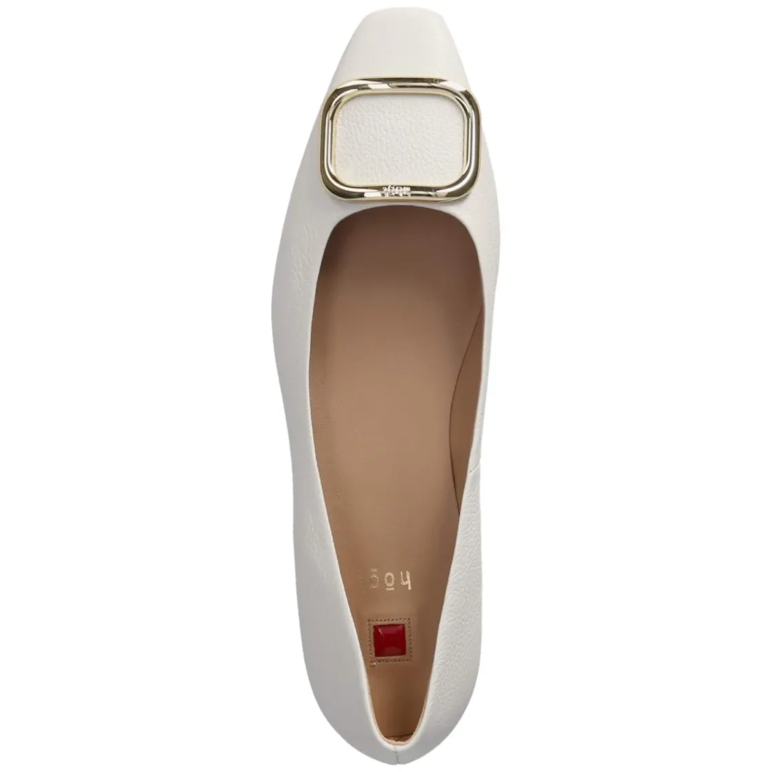 Eleganz und Komfort vereint: Dieser Damen-Ballerina von Högl setzt in strahlendem Weiß ein puristisches Statement. Robustes Glattleder formt eine klare Silhouette mit moderner Karree-Spitze, während goldfarbene Zierelemente und dezente Nähte einen feinen Akzent setzen. Die gepolsterte, hautfreundliche Lederdecksohle und das Innenfutter aus Leder sorgen für ein angenehm trockenes Fußklima – ideal für lange Tage im Büro und entspannte Stunden im Alltag. Ohne Verschluss gelingt das Hineinschlüpfen mühelos, die flexible Laufsohle unterstützt sanft jeden Schritt, die verstärkte Ferse hält die Form. Fällt normal aus. Modetipp: Besonders edel wirkt der Ballerina zu cremefarbenem Hosenanzug und feinem Goldschmuck, der die metallischen Details aufgreift.