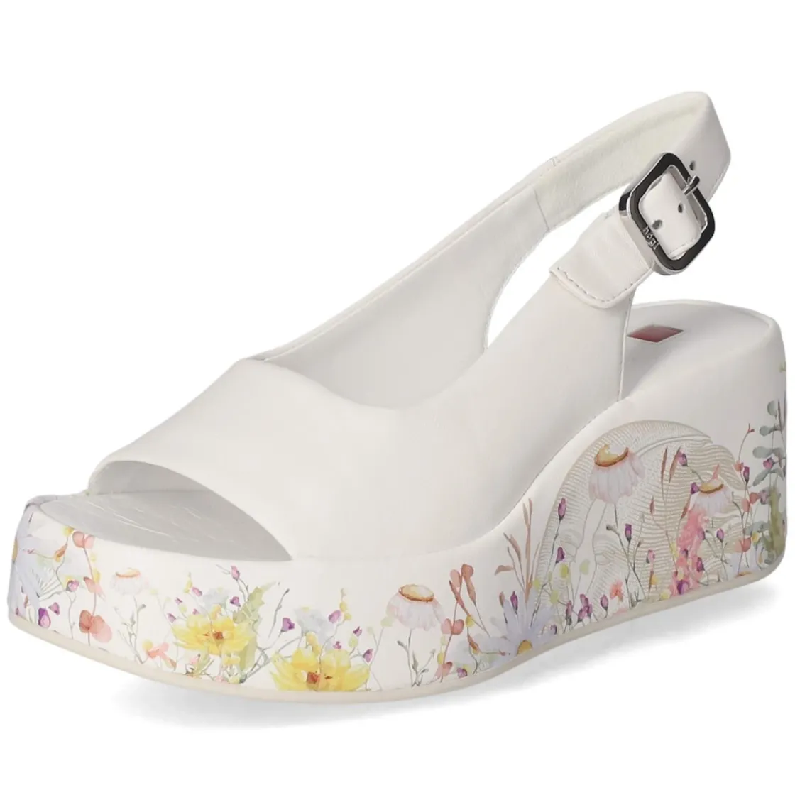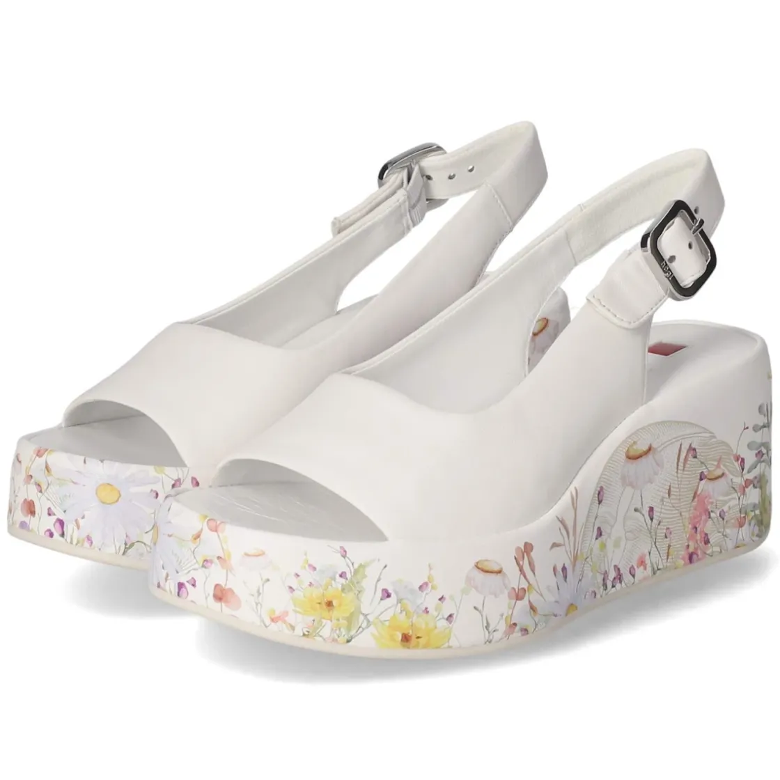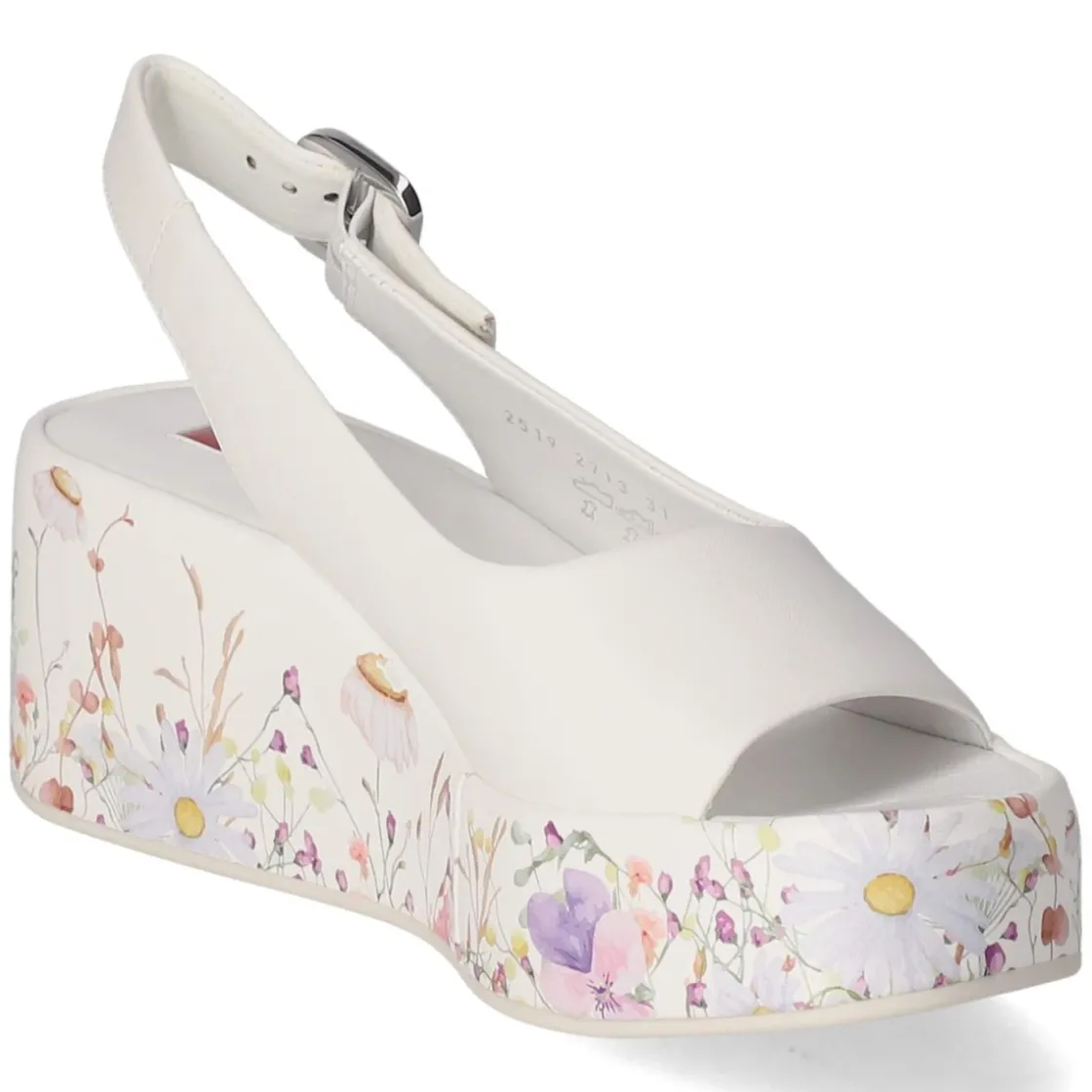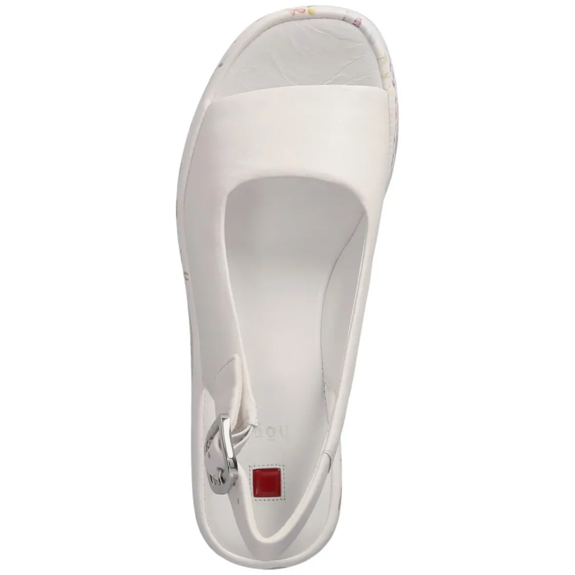 Die weißen Keilsandaletten von Högl vereinen feminine Leichtigkeit mit komfortabler Höhe. Hochwertiges Glattleder bildet das Obermaterial, atmungsaktives Echtleder und eine hautfreundliche Lederdecksohle schenken ein angenehm trockenes Fußklima. Die offene Schuhspitze unterstreicht die sommerliche Anmutung. Ein 7 cm hoher Keilabsatz sorgt für sanfte Streckung, während die rutschhemmende Laufsohle verlässlichen Halt gibt. Der Keil zeigt einen feinen Blumenprint, der jedem Outfit einen frischen Akzent verleiht. Eine Schnalle mit Elastikeinsatz erleichtert das Anpassen, der Fit fällt normal aus. Damit eignet sich das Modell für lange Tage in der City ebenso wie für den Abend auf der Terrasse. Modetipp: Zu fließenden Midikleidern oder Leinenhosen in Naturtönen wirkt das Weiß besonders edel; zarter Goldschmuck setzt die Schnalle stilvoll in Szene.