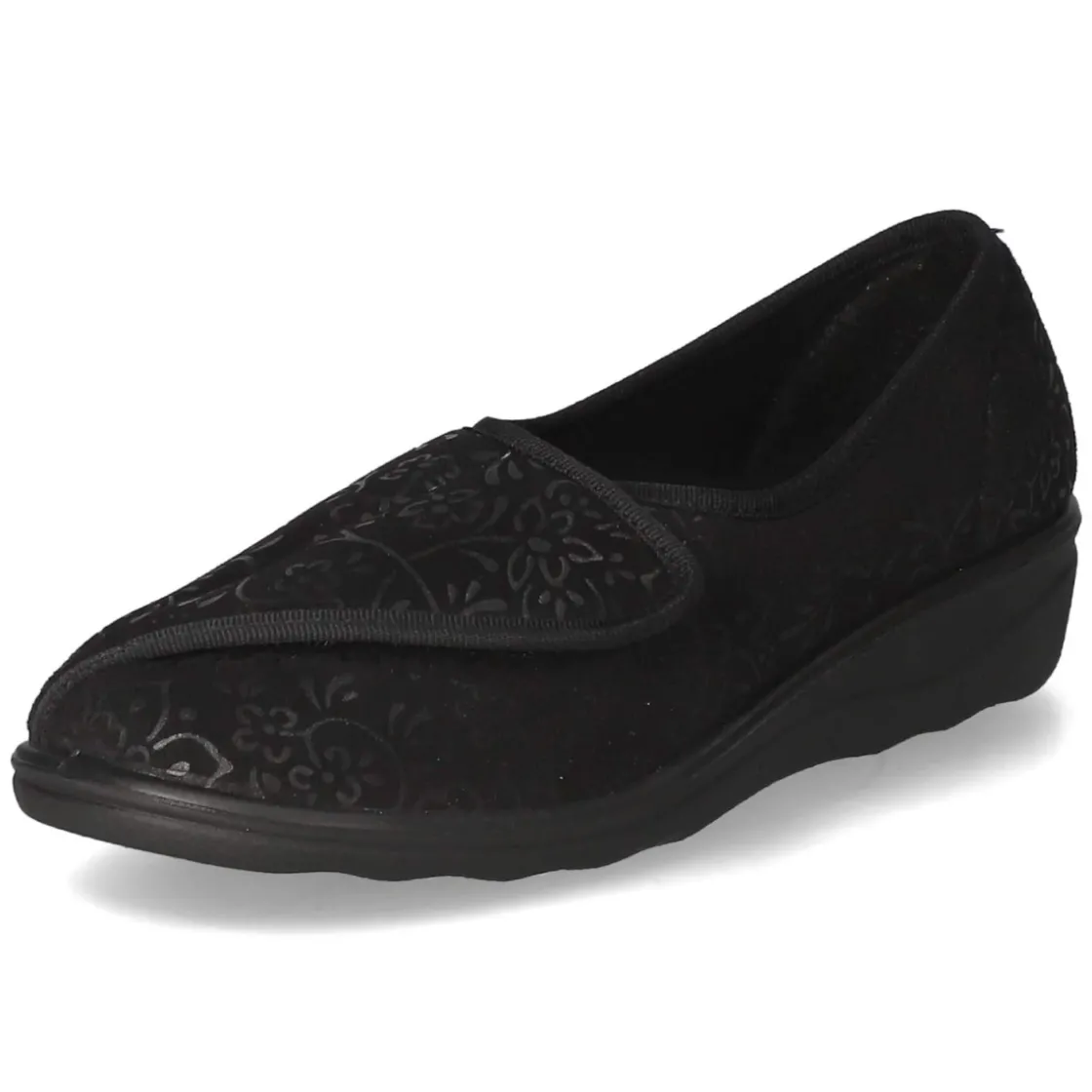 Die Hausschuhe NICE 104 von Josef Seibel verbinden behaglichen Komfort mit dezentem Stil. Das leichte Textilobermaterial in Schwarz schmiegt sich angenehm an und wird von einem schimmernden floralen Muster elegant akzentuiert. Dank rund gearbeiteter Schuhspitze und gepolsterter Decksohle entsteht ein weiches Auftrittsgefühl, das selbst lange Abende auf den Beinen entspannt. Das angenehme Textilfutter sorgt für ein ausgeglichenes Klima, während die flexible Laufsohle leise und anpassungsfähig bleibt. Der bequeme Klettverschluss ermöglicht eine schnelle, individuell regulierbare Passform, die durch die verstärkte Ferse stabil geführt wird. Das Modell fällt normal aus und bietet zuverlässigen Halt im Alltag daheim. Modetipp: Zu einem feinen Strickset in Anthrazit und weichen Kuschelsocken in Ton-in-Ton wirkt das dezente Schwarz besonders edel.