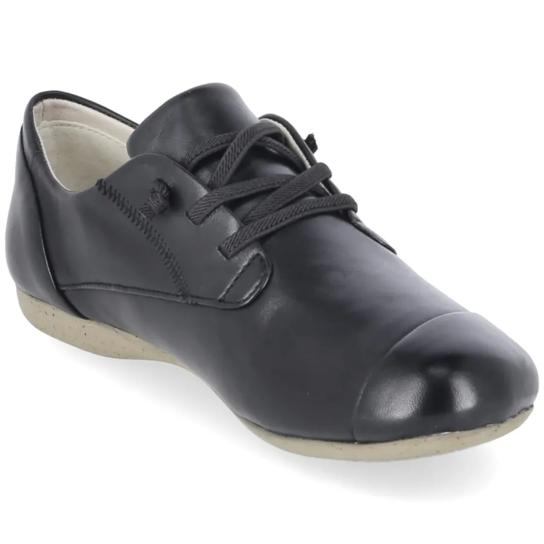 Der Slipper FIONA 01 von Josef Seibel vereint zeitlose Eleganz und Komfort für Damen. Schwarzes Glattleder in langlebiger Echtleder-Qualität trifft auf eine runde Schuhspitze und dezente Ziernähte, die dem Design Leichtigkeit verleihen. Das Lederfutter sorgt für ein angenehm ausgeglichenes Fußklima, unterstützt von einer Leder-Textil-Decksohle. Dank Wechselfußbett lässt sich die Einlage individuell anpassen. Die Schnürsenkel mit kurzer Elastikschnürung erleichtern den Einstieg und halten sicher, während eine dünne, flexible Laufsohle mit verlässlichem Grip ein relaxtes Leichtgewicht-Gefühl vermittelt. Verstärkte Fersen- und Zehenpartien bringen Stabilität in den Alltag. Der Schuh fällt normal aus und passt so unkompliziert zur gewohnten Größe. Modetipp: Als ruhiger Kontrast zu fließenden Midikleidern oder zu Cropped-Jeans und einem weißen Hemd getragen, entsteht ein moderner, reduzierter Look.