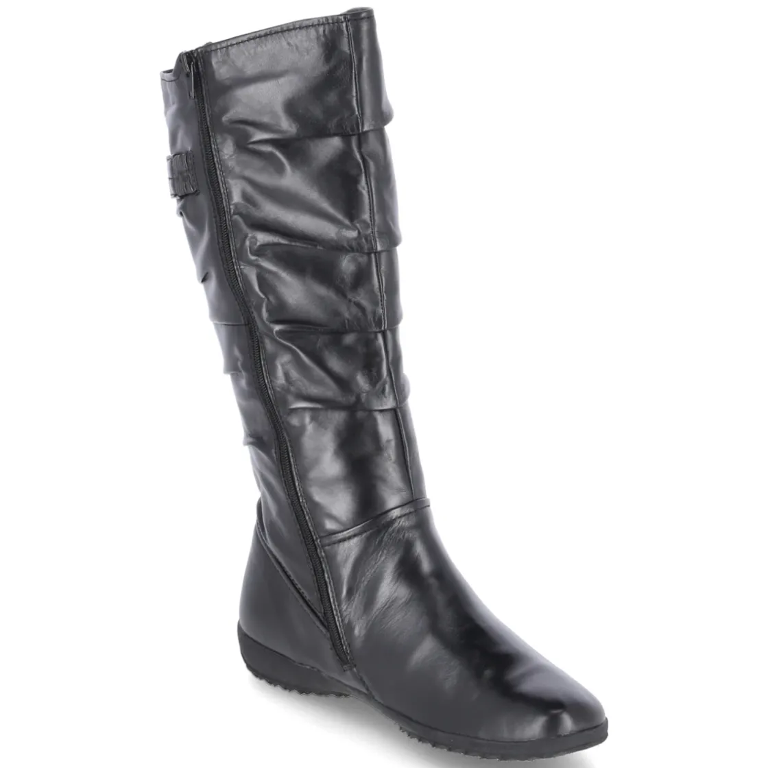 Der Stiefel NALY 23 von Josef Seibel vereint lässige Optik mit funktionalen Details. Der robuste Material-Mix aus Leder und Textil in tiefem Schwarz wird durch den leicht gerafften Schaft akzentuiert und erhält so eine feminine, zugleich entspannte Silhouette. Ein seitlicher Reißverschluss ermöglicht schnelles An- und Ausziehen, während die verstärkte Ferse Stabilität gibt. Im Inneren sorgt ein angenehm leichtes Warmfutter aus Fleece für behagliche Wärme an kühlen Tagen, die textile Decksohle und das gepolsterte Fußbett erhöhen den Tragekomfort. Die flexible, rutschhemmende Laufsohle unterstützt einen sicheren Schritt, die runde Schuhspitze bietet Zehenfreiheit. Das relaxtes Leichtgewicht fällt größengetreu aus und eignet sich ideal für den Alltag. Modetipp: Zu schmalen Jeans und einem weichen Strickpullover kombinieren, darüber ein Wollmantel – fertig ist ein zeitloser City-Look.