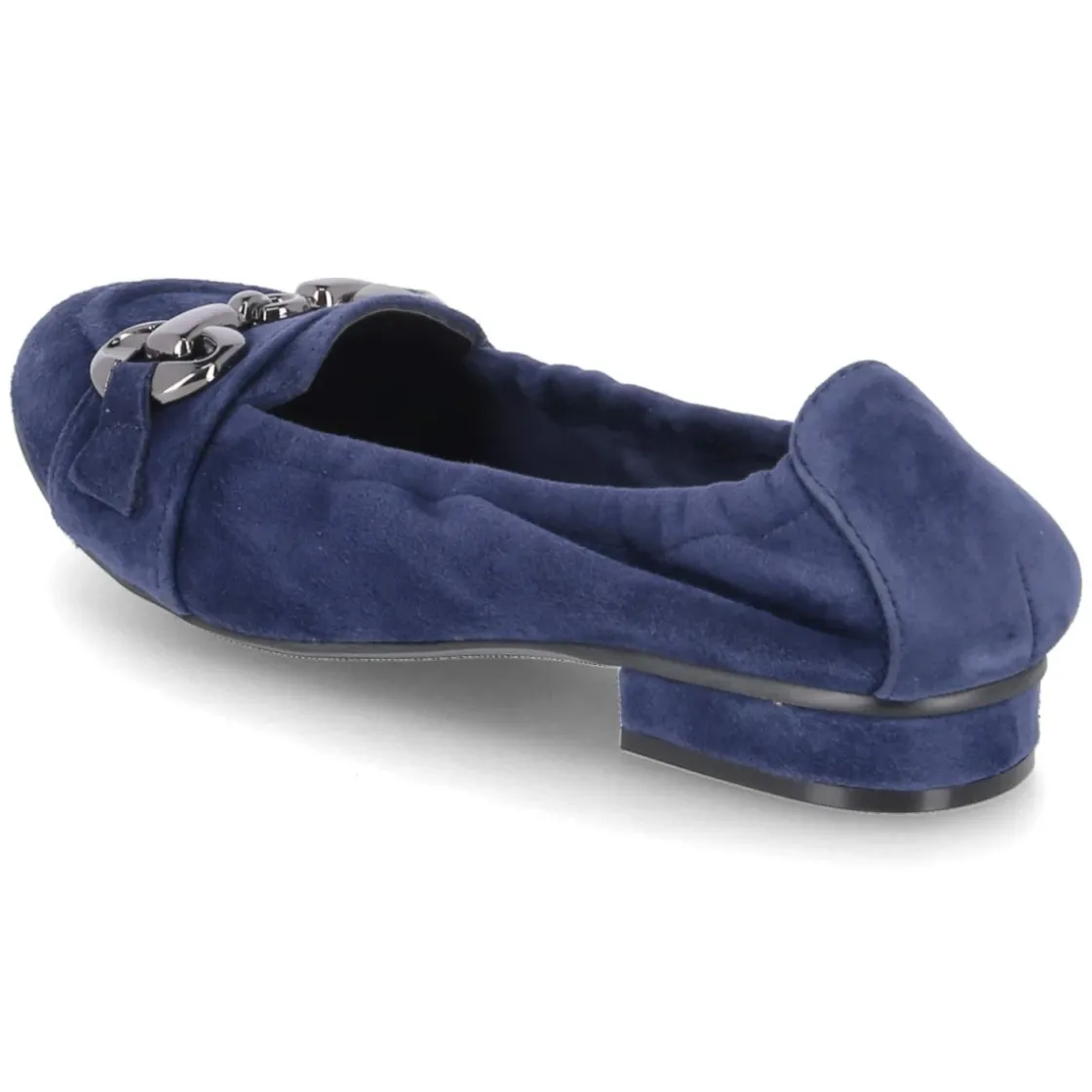 Eleganter Alltagsbegleiter mit Komfortfaktor: Der Ballerina von Kaerlek zeigt sich in edlem Blau und kombiniert zeitlose Linien mit durchdachten Details. Das Obermaterial aus langlebigem Rauleder schmiegt sich weich an, während die verstärkte Ferse und die runde Spitze für formstabilen Halt und eine feminine Silhouette sorgen. Ein elastischer Einstieg erleichtert das Hineinschlüpfen, die gepolsterte Lederdecksohle verwöhnt mit sanfter Dämpfung. Der 2 cm hohe Blockabsatz entlastet dezent und unterstützt einen sicheren Gang, verstärkt durch die sehr flexible, rutschhemmende Laufsohle. Markantes Highlight ist der über dem Spann verlaufende Zierriemen samt kleiner Zunge und Metallelement in glänzender Titanoptik. Ohne Verschluss gehalten, fällt das Modell normal aus und punktet im Tagesverlauf mit hoher Bequemlichkeit. Modetipp: Zum cropped Jeans-Anzug oder zu Midikleidern in Creme erzeugt das Blau einen ruhigen, modernen Kontrast.