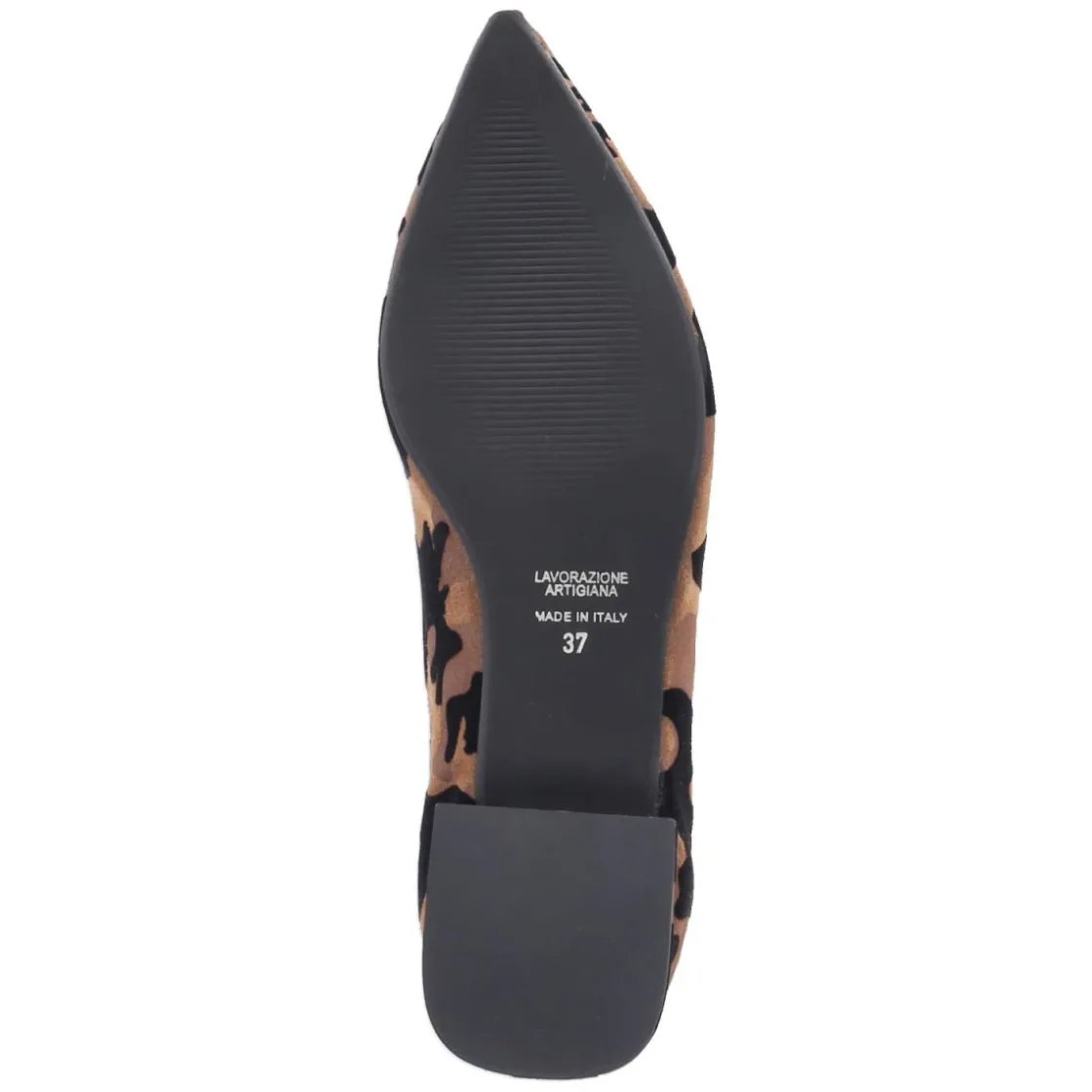 Diese Damen-Ballerinas von Kaerlek interpretieren den Klassiker mit urbaner Lässigkeit: Braunes Camouflage auf softem Rauleder trifft auf eine spitze Silhouette, die den Fuß optisch streckt. Quasten über dem Zehenbereich setzen einen verspielten Akzent, während der flache Blockabsatz Stabilität verleiht. Die Lederdecksohle und ein leicht gepolsterter Fersenbereich sorgen für angenehmen Komfort, unterstützt vom relaxten Leichtgewicht-Charakter und der flexiblen, griffigen Laufsohle. Die Schlupfform ohne Verschluss macht das Anziehen unkompliziert, die Passform fällt normal aus und begleitet souverän Büro- wie Wochenend-Looks. Modetipp: Besonders stimmig zu monochromen Sand- und Beigetönen mit feinen Goldaccessoires; starke Kontraste entstehen mit schwarzer Zigarettenhose und strukturiertem Blazer.