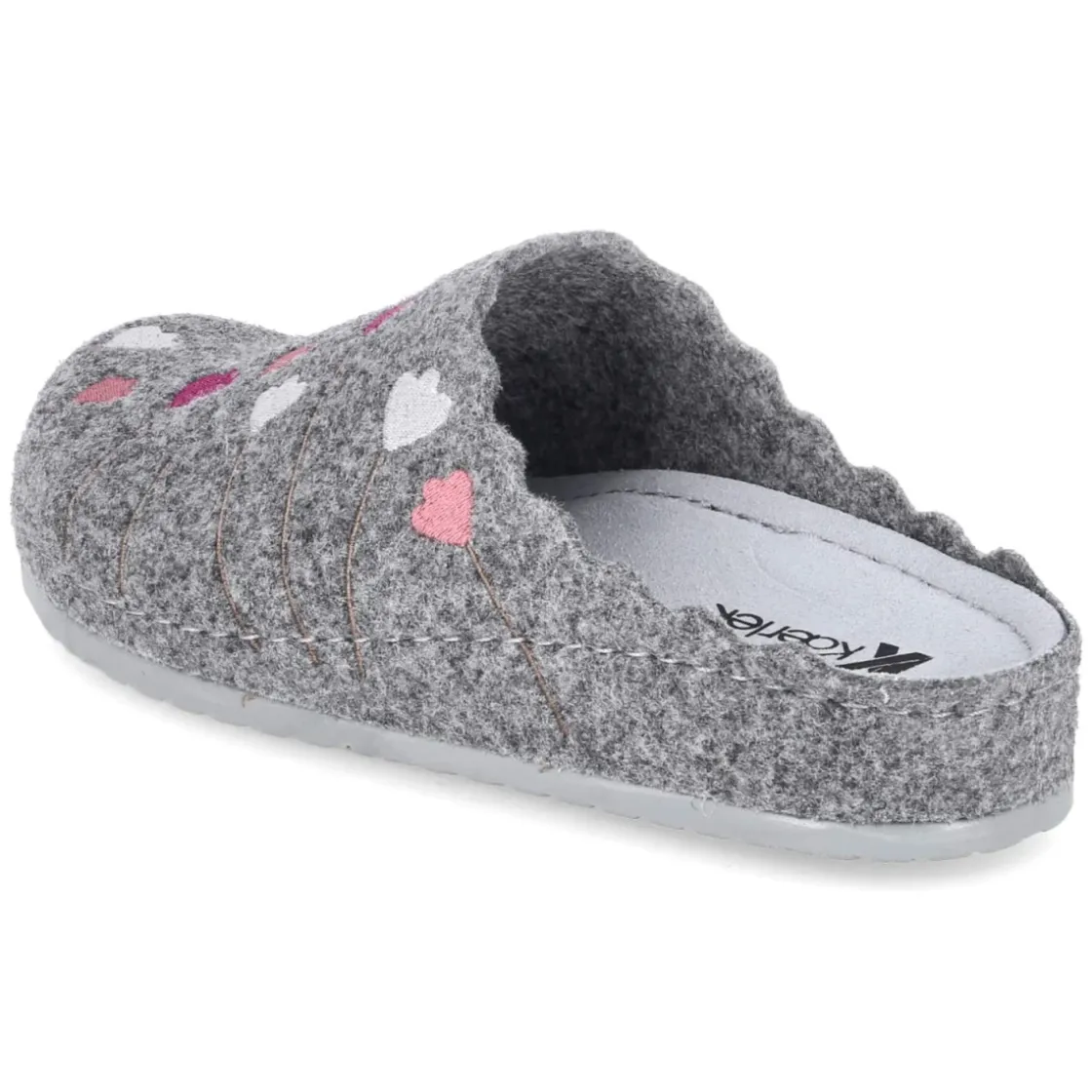 Pantoffeln NANA von Kaerlek stehen für gemütliche Stunden und zeitloses Design. Das robuste Filz-Textilobermaterial schmiegt sich angenehm an und zeigt mit seitlicher Blumenstickerei und feinem Motiv einen zurückhaltenden Akzent im grauen Ton. Die runde Spitze schafft Zehenfreiheit, während ein Elastikeinsatz am Spann für sicheren Halt sorgt. Im Inneren unterstützt eine vorgeformte, weiche Decksohle aus Leder das Fußgewölbe und macht jeden Schritt zuhause besonders komfortabel. Die flexible Laufsohle passt sich der Bewegung an und bietet leises, trittsicheres Gehen auf unterschiedlichen Böden. Dank schlupffreundlicher Machart ohne Verschluss ist schnelles Hineinschlüpfen möglich, zudem fällt das Modell normal aus. Modetipp: Zu Lounge-Hosen aus Strick und einem melierten Oversize-Pullover kombinieren, dazu Wollsocken in einem hellen Grauton für einen monochromen, eleganten Home-Look.