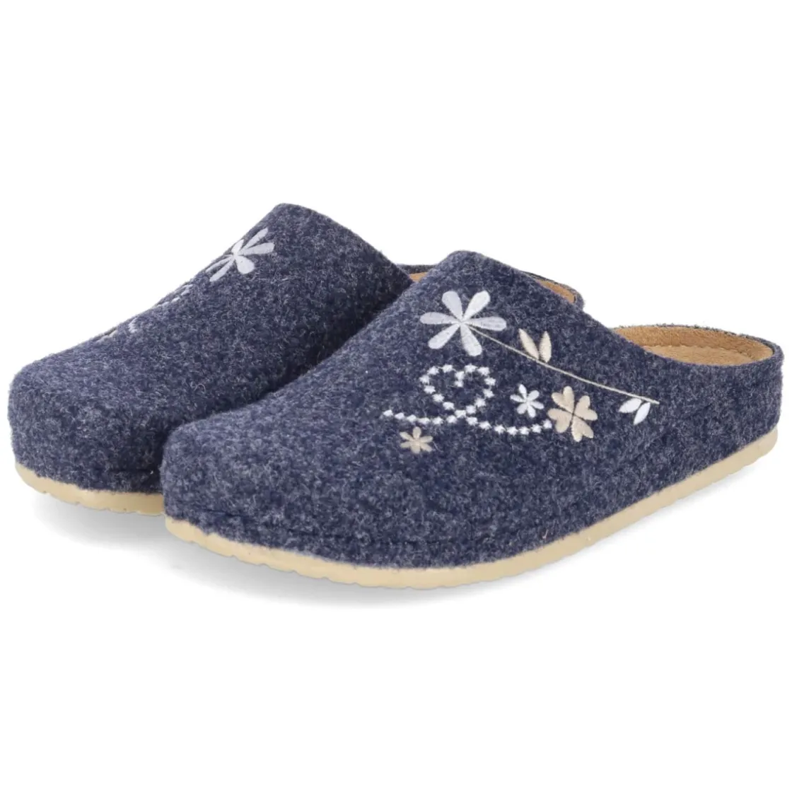 Pantoffeln NANA von Kaerlek vereinen gemütliche Wärme mit einem klassischen Auftritt. Das dunkelblaue Filz-Obermaterial zeigt eine feine Blumenstickerei und wirkt dank robuster Textilstruktur langlebig und formstabil. Die vorgeformte Decksohle aus Leder schmiegt sich angenehm an und bietet unterstützenden Halt bei entspannten Stunden zuhause. Eine flexible Laufsohle sorgt für leises Abrollen und leichte Schritte, während die runde Spitze natürlichen Zehenraum lässt. Der Schlupfschuh ohne Verschluss präsentiert ein klares Design, das zu vielen Loungewear-Looks passt. Das Modell fällt normal aus und ist ideal für Damen, die unkomplizierte Bequemlichkeit schätzen. Modetipp: Harmoniert besonders stimmig mit einem cremefarbenen Strick-Cardigan und lockerer Jerseyhose; wollige Socken in Dunkelblau greifen die Stickerei elegant auf.