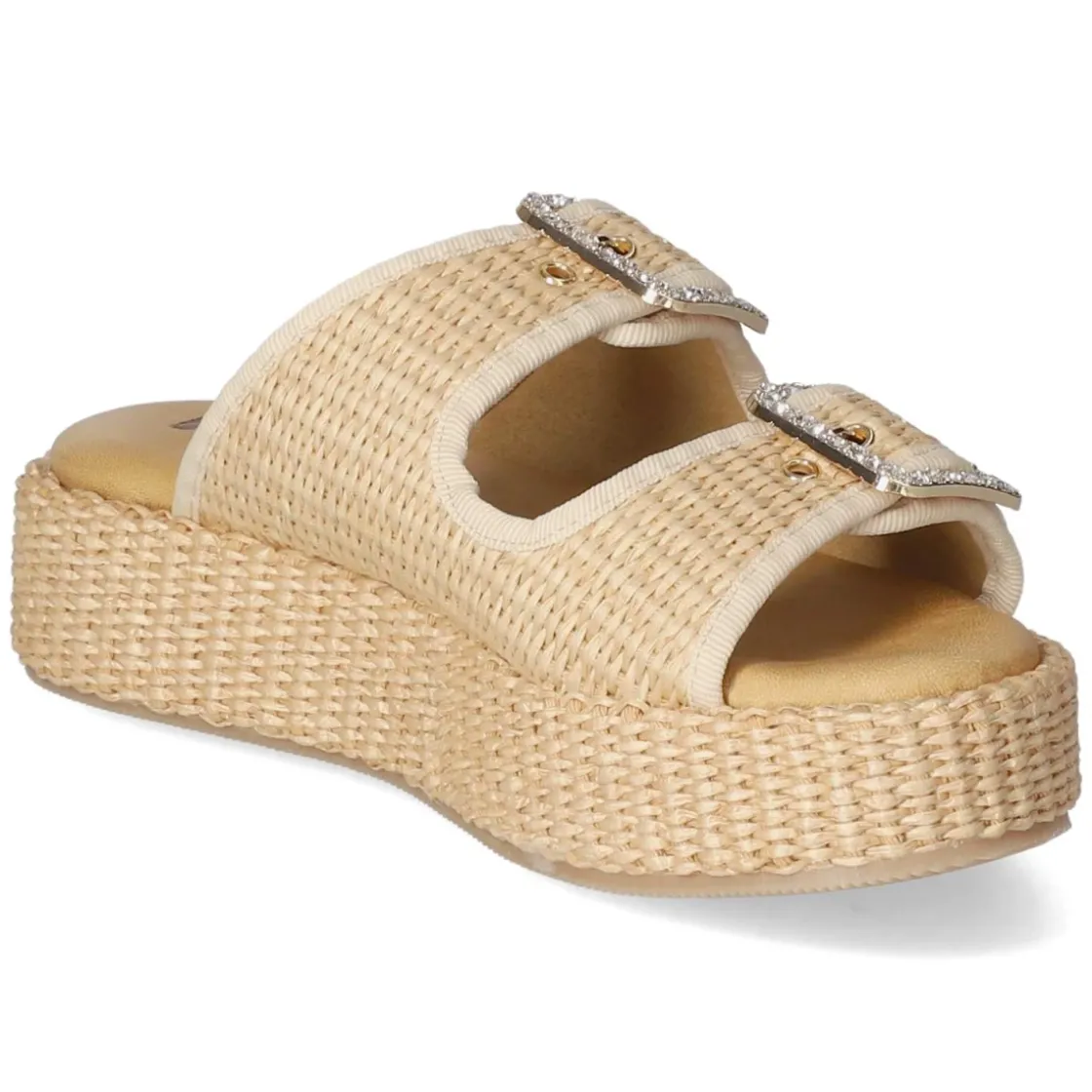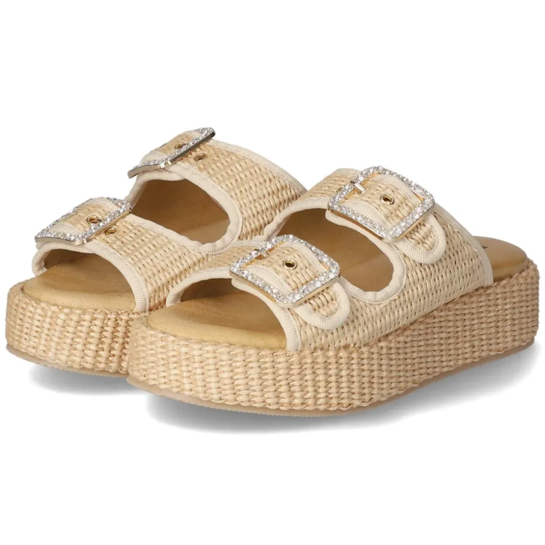 Die Pantoletten NATURALE von Kaerlek verbinden sommerliche Leichtigkeit mit modernem Design. Das beige Obermaterial aus hochwertig modern designter Synthetik zeigt eine feine Sisaloptik, die zusammen mit dem 4,5 cm hohen Plateau eine natürliche Textur und angenehme Höhe bringt. Die offene Schuhspitze unterstreicht den luftig-freien Charakter, während zwei goldfarbene Schnallen mit glitzernden Schmucksteinen einen eleganten Akzent setzen. Dank sicherer Schnallen lässt sich die Weite individuell anpassen, das gepolsterte Fußbett und die Decksohle aus Leder sorgen für dauerhaften Tragekomfort. Die Passform fällt normal aus und begleitet mühelos durch Alltag und Stadtbummel. Modetipp: zu fließenden Leinenkleidern oder Culottes und einer Basttasche kombinieren – die neutrale Beige-Nuance und die Sisaloptik harmonieren perfekt mit natürlichen Materialien.