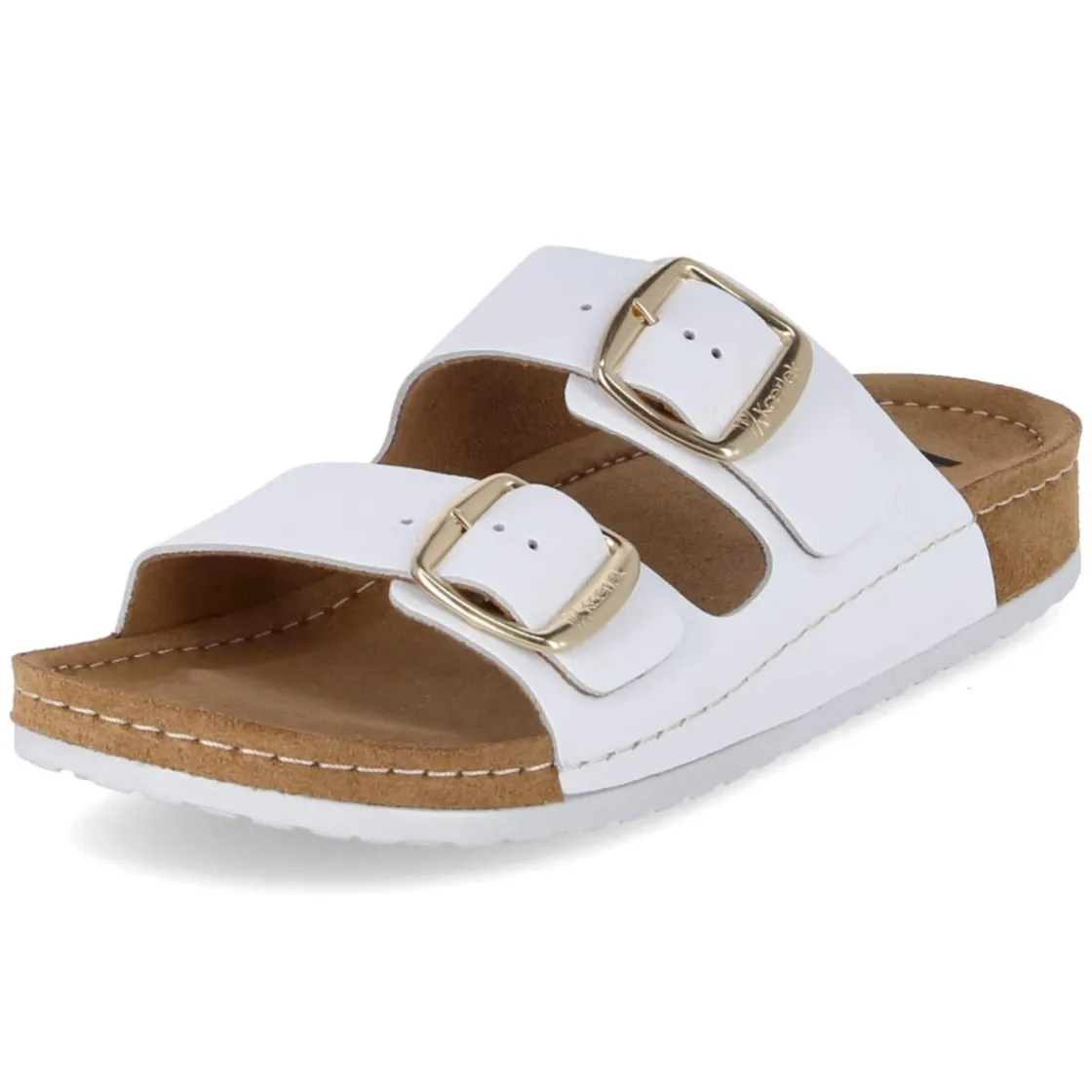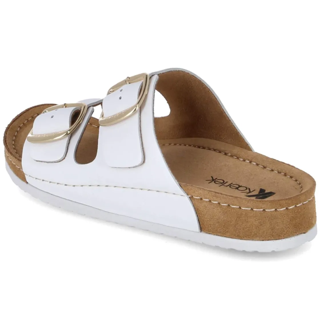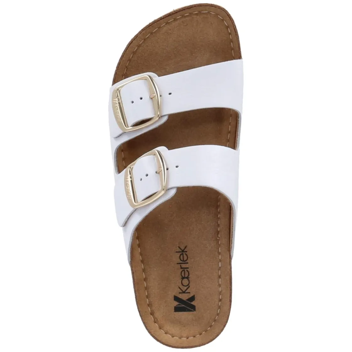 Zeitloser Sommerbegleiter mit eleganter Note: Die weißen Pantoletten von Kaerlek verbinden reduziertes Design und hochwertige Materialien. Weiches Glattleder in langlebiger Echtleder-Qualität umschließt den Fuß mit zwei Riemen, deren Schnallen in Goldoptik einen dezenten, edlen Akzent setzen. Das leicht gepolsterte, vorgeformte Lederfußbett sorgt für angenehmen Halt und unterstützt bei längeren Tagen auf den Beinen. Die offene Schuhspitze unterstreicht die luftige Wirkung, während die Schnalle gezielten Sitz ermöglicht. Die Passform fällt schmaler aus und wirkt entsprechend feingliedrig. Durch die klare Silhouette lassen sich zahlreiche Outfits stimmig ergänzen – von sommerlichen Kleidern bis hin zu cleanen Denim-Looks. Modetipp: Die goldfarbenen Details harmonieren besonders schön mit filigranem Schmuck und einer Leinenhose in Naturtönen, wodurch der helle Lederton noch strahlender zur Geltung kommt.