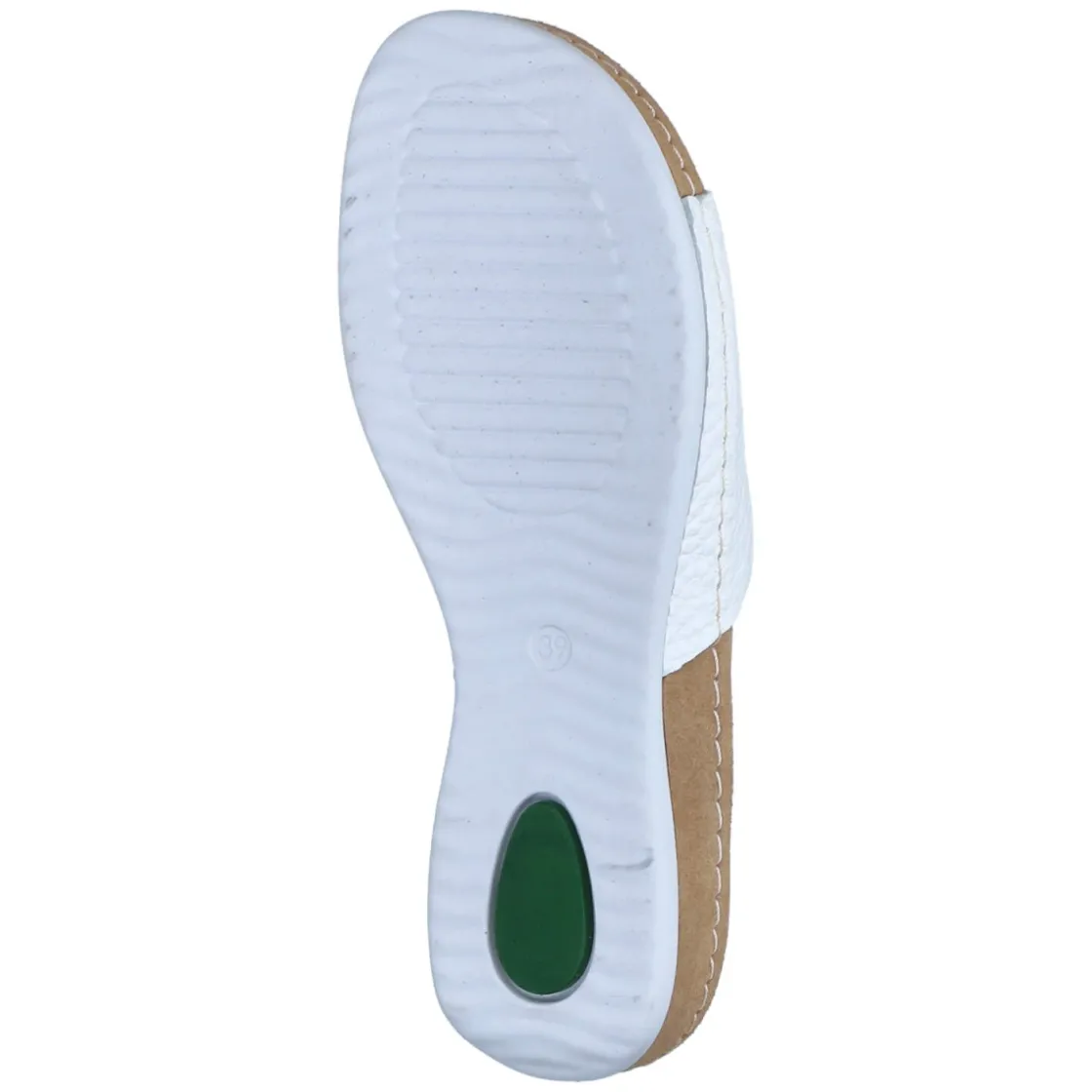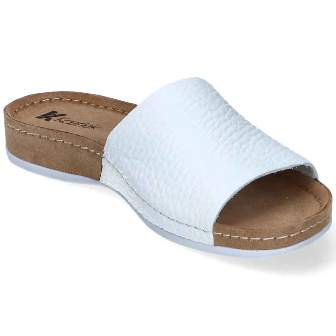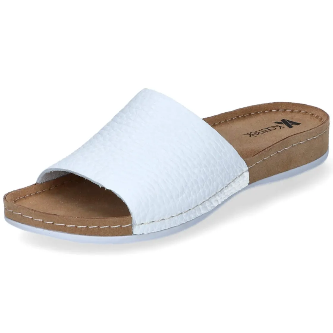 Die Pantoletten von Kaerlek verbinden reduziertes Design mit hohem Tragekomfort. Glattes, langlebiges Echtleder in strahlendem Weiß trifft auf einen breiten Riemen, der sicher über dem Spann liegt und dem offenen Schnitt eine elegante Note verleiht. Die hautfreundliche Lederdecksohle und das vorgeformte, weich gepolsterte Tieffußbett unterstützen den Fuß angenehm bei jedem Schritt. Dank flexibler, rutschhemmender Laufsohle mit leichtem Profil gelingen auch längere Wege entspannt. Ohne Verschluss entsteht sommerliche Leichtigkeit beim schnellen Hineinschlüpfen. Der Größenhinweis fällt schmaler aus und betont eine schlanke Silhouette. Modetipp: Zu Leinenkleidern oder einer weißen Culotte entsteht ein cleaner Look, der mit goldfarbenen Accessoires und einer dezenten Pediküre besonders edel wirkt.