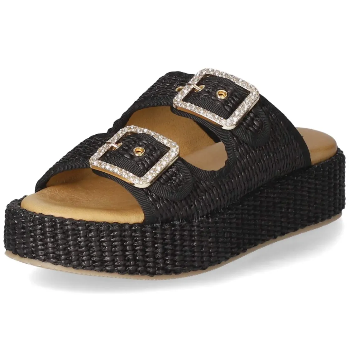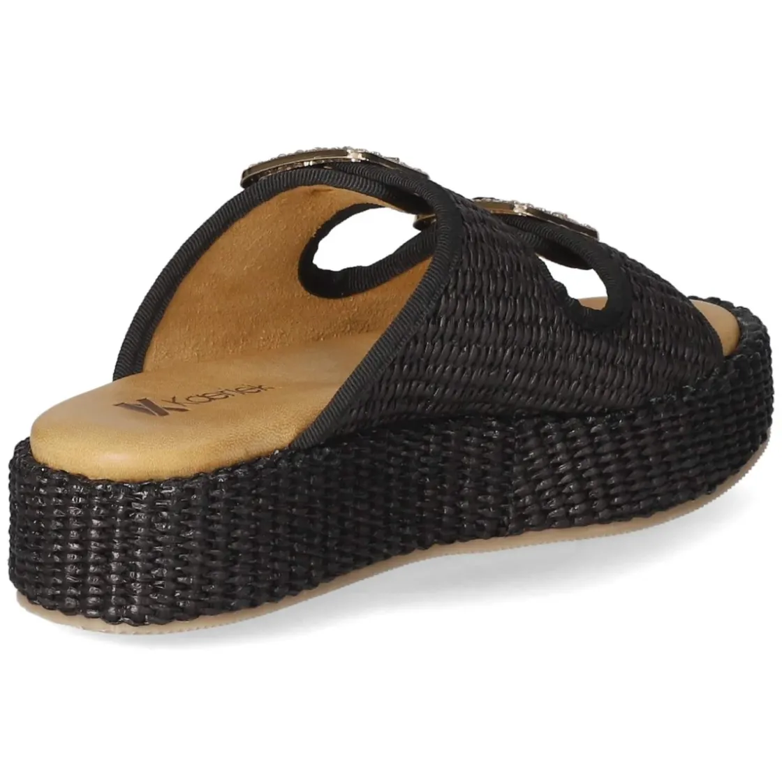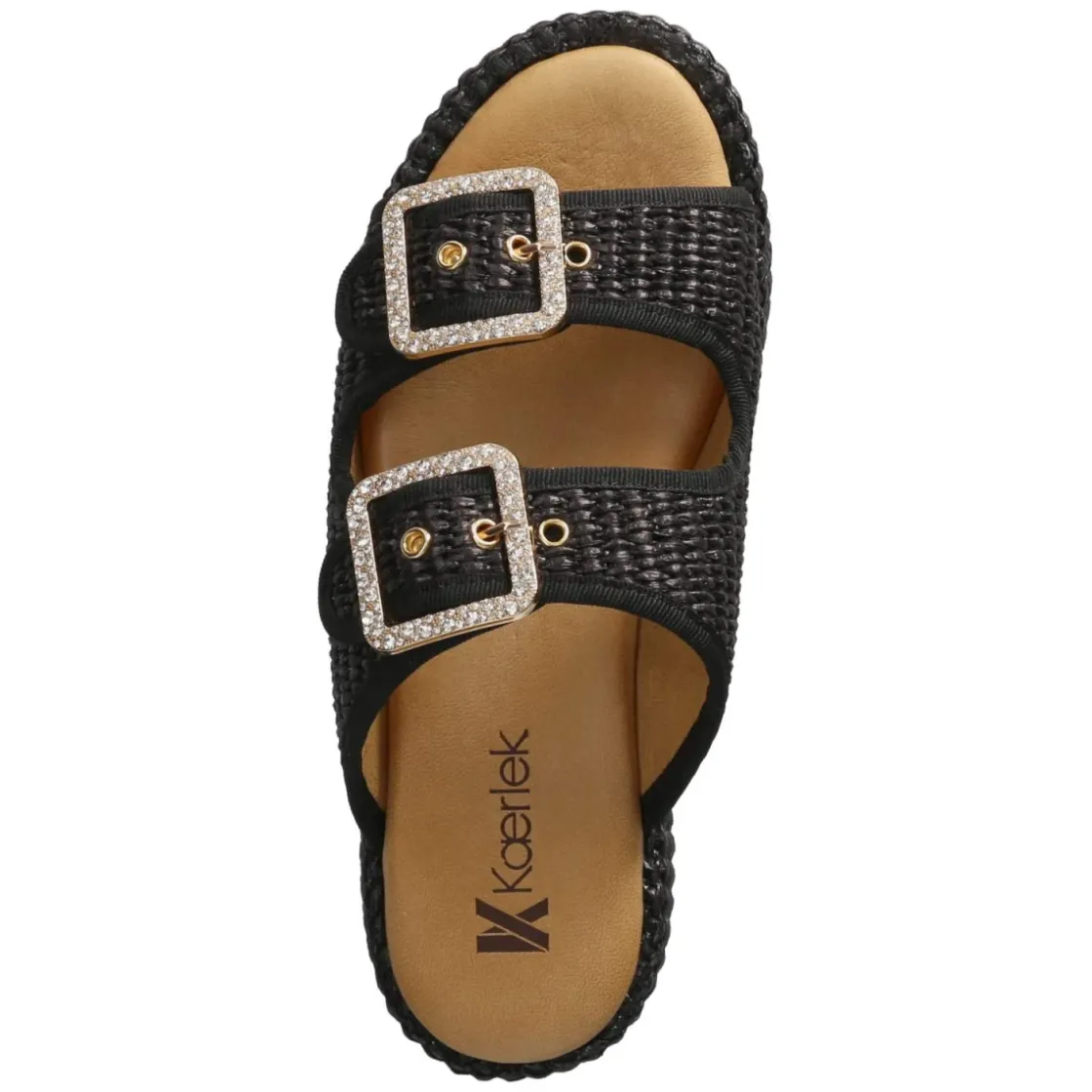 Pantoletten NERO von Kaerlek verbinden moderne Optik mit komfortabler Konstruktion. Das schwarze Modell setzt auf eine 4,5 cm hohe Plateau-Absatzform, die die Silhouette dezent streckt und dank breiter Auflagefläche stabil wirkt. Zwei goldfarbene Schnallen mit funkelnden Schmucksteinen verleihen Glamour; Details in Sisaloptik bringen sommerliche Struktur. Ein modern designtes Obermaterial aus Synthetik trifft auf eine Decksohle aus Leder, während das weich gepolsterte Fußbett angenehmen Halt schenkt. Die offene Schuhspitze unterstreicht die luftige Anmutung, der verstellbare Schnallenverschluss sorgt für passgenauen Sitz. Das Modell für Damen fällt normal aus und überzeugt im Alltag ebenso wie abends. Modetipp: Besonders edel wirkt die Pantolette zu einem monochromen Schwarz-Look mit goldenen Accessoires oder zu Raw-Denim und weißem Oversize-Hemd.