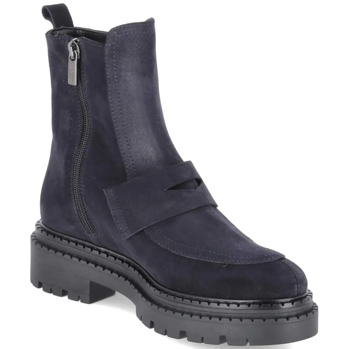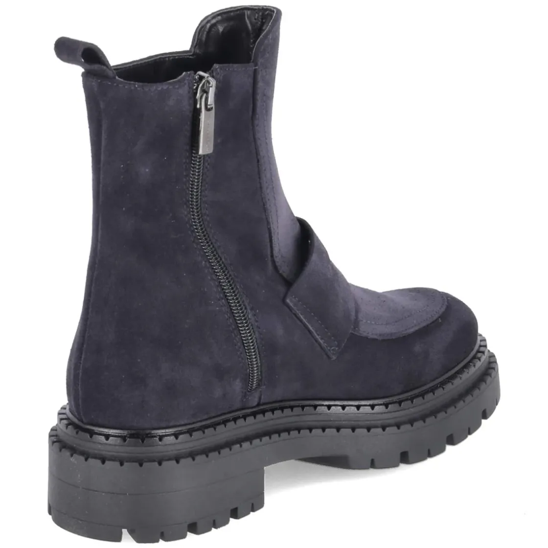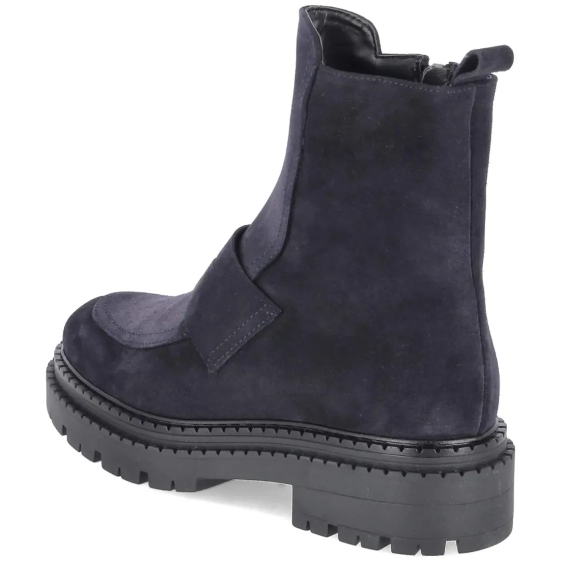 Die Kaerlek Stiefeletten in elegantem Dunkelblau vereinen zeitloses Design und komfortable Ausstattung. Das Obermaterial aus hochwertigem Rauleder und das langlebige Echtleder sorgen für eine edle Haptik, während die runde Spitze und der 4,5 cm hohe Blockabsatz ein feminines, alltagstaugliches Profil formen. Ein Reißverschluss und die praktische Anziehlasche ermöglichen einen unkomplizierten Einstieg, das leicht gepolsterte Fußbett bietet angenehme Dämpfung auch an längeren Tagen. Für sicheren Tritt steht die rutschhemmende Laufsohle, die auf glatteren Böden verlässliche Stabilität gibt. Die Ledersohle an der Innenseite unterstützt ein ausgeglichenes Fußklima. Ein Zierriemen über dem Spann setzt einen dezenten Akzent und unterstreicht den modernen Charakter. Größenhinweis: fällt normal aus. Modetipp: Dunkelblaue Stiefeletten harmonieren besonders schön mit cremefarbenem Strick und dunkelblauen Straight-Jeans, dazu ein kamelfarbener Mantel für einen weichen Kontrast.