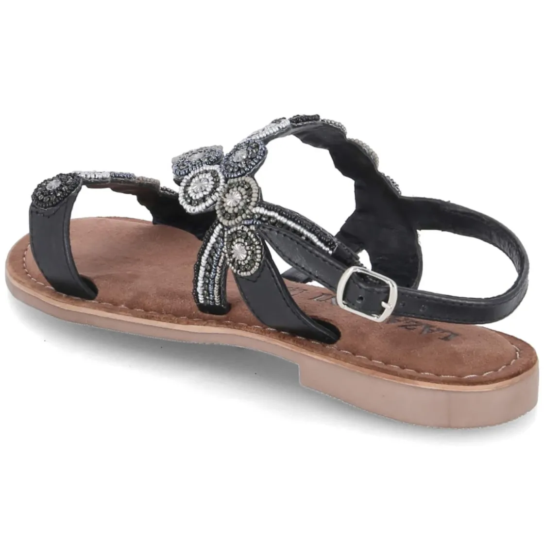 Die LAZAMANI Sandalen in klassischem Schwarz verbinden elegantes Design mit durchdachtem Komfort. Das Obermaterial aus Leder und Textil schmiegt sich angenehm an, während die Decksohle aus Leder mit einem weich gepolsterten Fußbett langen Tagen gelassen begegnet. Eine fein gearbeitete Schnalle mit Elastikeinsatz sorgt für sicheren Halt und unkompliziertes An- und Ausziehen. Die offene Schuhspitze und funkelnde Perlenapplikationen setzen feminine Akzente, die sowohl zu luftigen Sommerkleidern als auch zu Denim-Styles harmonieren. Dank der flexiblen, rutschfesten Laufsohle bleibt der Schritt stabil – vom Stadtbummel bis zur Sommerparty. Der Größenhinweis fällt normal aus und macht die Wahl leicht. Modetipp: Für einen modernen Kontrast wirken die Sandalen zu monochromen Looks in Schwarz oder Creme besonders edel; eine zarte Fußkette unterstreicht das stilvolle Finish.
