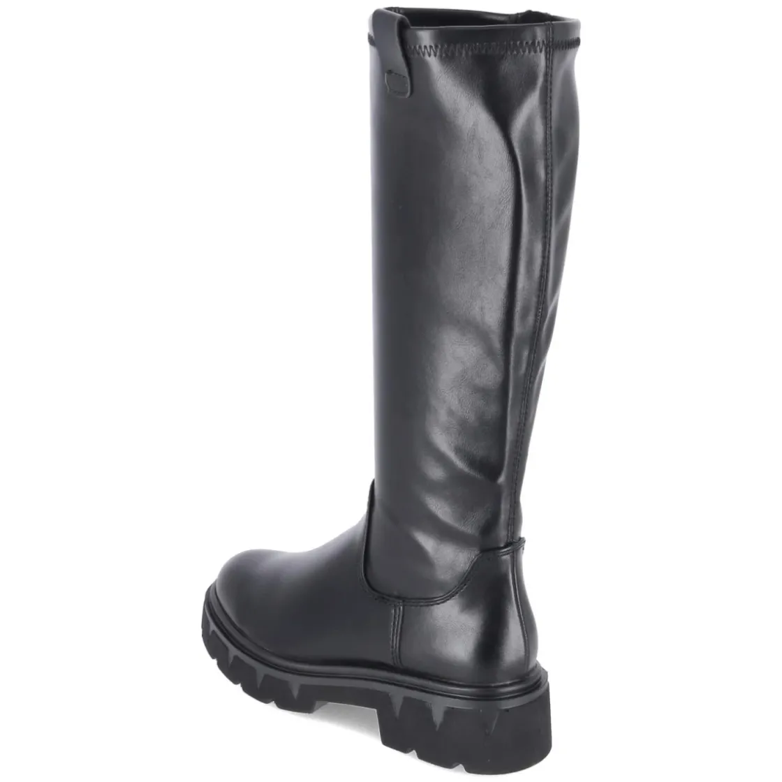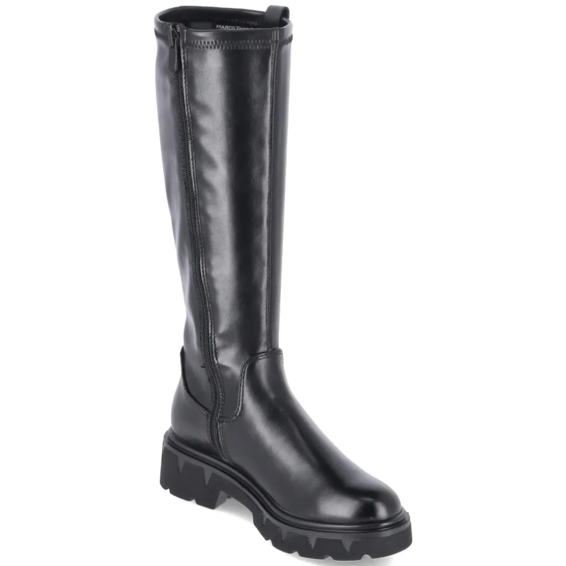 Der schwarze Schaftstiefel von Marco Tozzi vereint klaren Look und Alltagstauglichkeit. Das glatte Obermaterial aus Synthetik setzt eine edle Note, bleibt dank veganer Materialien tierfrei. Ein 5 cm hoher Blockabsatz sorgt für Standfestigkeit, die runde Spitze wirkt lässig und zeitlos. Der seitliche Reißverschluss und eine praktische Anziehlasche erleichtern den Einstieg, während der stretchige Schaft mit ca. 37 cm Höhe und etwa 34 cm Umfang bequem am Bein anliegt. Innen verwöhnt leichtes Futter an kühlen Tagen, das gepolsterte Fußbett und das relaxt leichte Tragegefühl begleiten mühelos durch lange Wege. Die textile Decksohle ergänzt den Komfort. In der Passform fällt das Modell normal aus und fügt sich unkompliziert in den Alltag. Modetipp: Zu Midikleid in Strick und Oversize-Mantel entsteht eine elegante Linie, die den Blockabsatz betont und den Stiefel zum ruhigen Anker urbaner Looks macht.