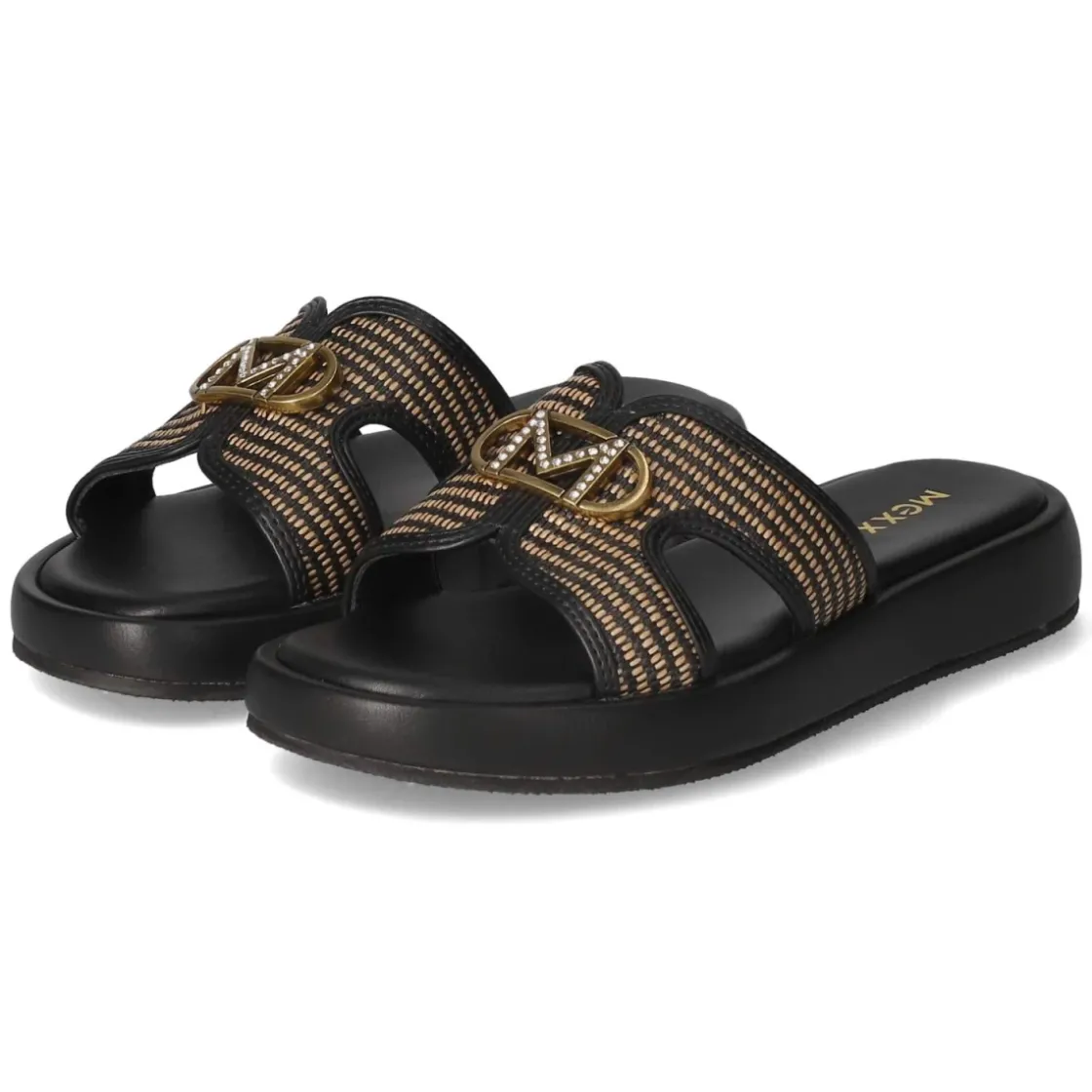 Die Pantoletten RAMI PACHA von Mexx verbinden moderne, elegante Optik mit unkompliziertem Tragekomfort. Das hochwertig anmutende Synthetik-Obermaterial präsentiert zwei verbundene Zierriemen, die den Fuß stilvoll rahmen, während die offene Schuhspitze dem Design Leichtigkeit verleiht. Goldfarbene Markendetails mit funkelnden Schmucksteinen setzen einen edlen Akzent; das schwarz-braun gestickte Muster bringt subtilen Kontrast ins Spiel. Dank leicht vorgeformtem Fußbett und synthetischer Decksohle entsteht ein angenehmes Laufgefühl, das im Alltag ebenso überzeugt wie beim abendlichen Ausgehen. Ohne Verschluss einfach hineinschlüpfen, und der sympathische Look ist komplett. Die Passform fällt normal aus, wodurch sich gewohnte Größenwahl anbietet. Modetipp: Besonders harmonisch wirken die Pantoletten zu fließenden Midikleidern in Naturtönen oder zu einer schwarzen Culotte, ergänzt durch goldene Accessoires, die die edlen Details der Riemen widerspiegeln.