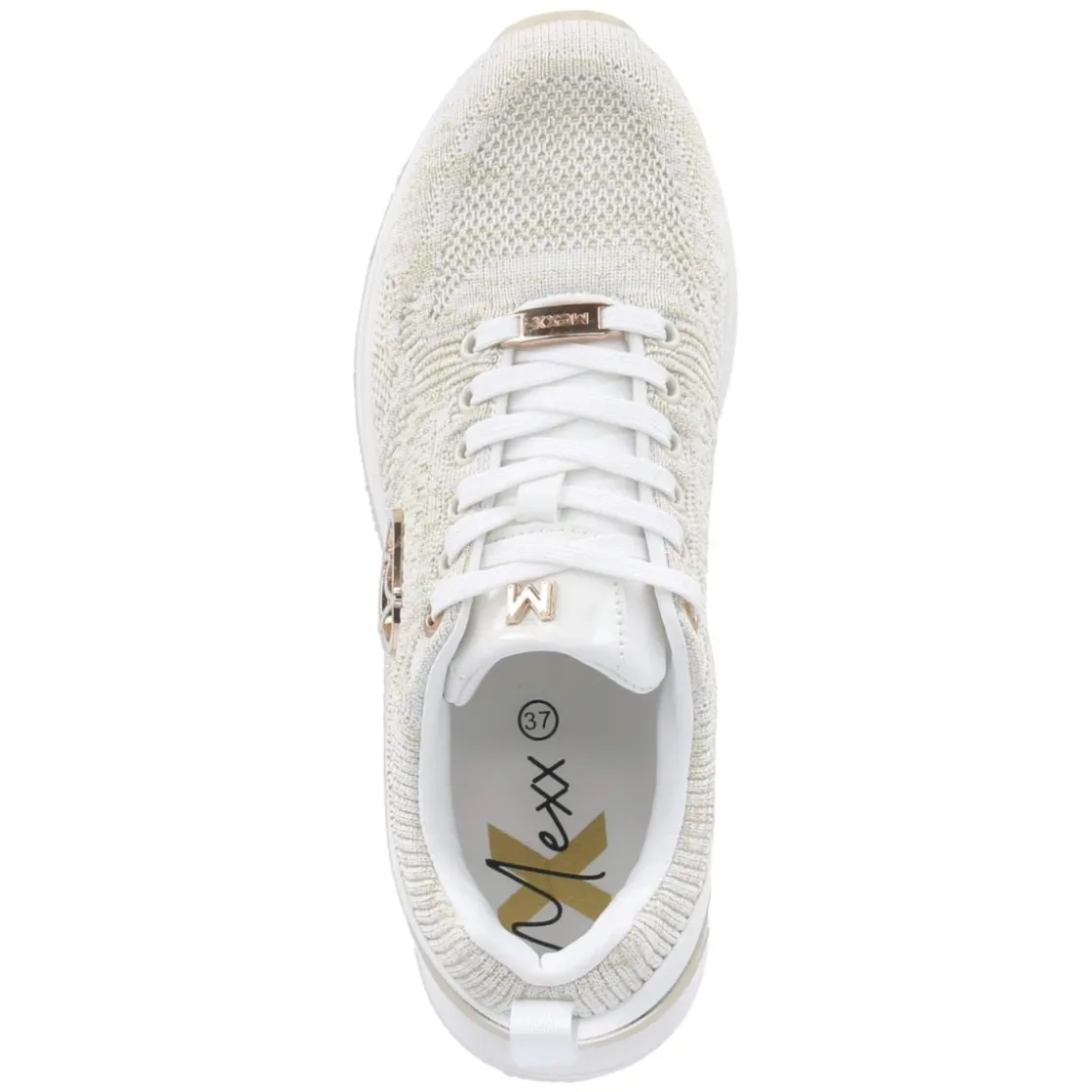 Der Sneaker ROX ORLANDO von Mexx verleiht Alltagslooks einen Hauch Glamour. Das weiße Obermaterial aus Textil und Synthetik zeigt eine moderne Strick-Optik mit dezent glitzerndem Mesh, das Markendetails raffiniert in Szene setzt. Die runde Schuhspitze und die klassische Schnürung sorgen für eine zeitlose Silhouette, während ein gepolsterter Einstieg und der verstärkte Zehen- und Fersenbereich angenehmen Halt geben. Das gepolsterte Wechselfußbett aus Synthetik erhöht den Komfort und kann bei Bedarf ausgetauscht werden. Eine flexible, rutschhemmende Laufsohle begleitet sicher durch den Tag. Der Schnitt fällt normal aus und lässt sich vielseitig kombinieren, vom City-Look bis zum Office-Casual. Modetipp: Mit weißen Socken, einer hellen Anzughose und einem feinen Stricktop entsteht ein cleaner, femininer Athleisure-Style.