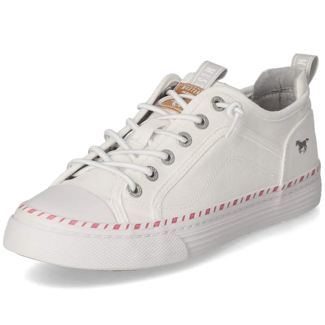 Der weiße Low Sneaker von Mustang verbindet lässige Optik mit hohem Tragekomfort. Das textile Obermaterial mit griffiger Haptik und runder Spitze wirkt clean, während weiße Ziernähte und dezente Markendetails das Design veredeln. Schnürung und ein kleiner Elastikeinsatz am Spann erleichtern den Einstieg, zusätzlich unterstützt von Anziehlasche und gepolsterter Ferse. Das weich gepolsterte Fußbett sorgt für angenehme Dämpfung im Alltag. Zehen- und Fersenbereich sind verstärkt, die flexible, rutschhemmende Cupsohle bietet zuverlässigen Halt auf verschiedenen Untergründen. Dank normaler Passform fällt das Modell größengetreu aus und eignet sich ideal für erwachsene Trägerinnen. Modetipp: Für einen frischen City-Look den Sneaker zu Cropped-Jeans, gestreiftem Shirt und leichtem Trench kombinieren – weiße Accessoires greifen den Ton auf und lassen das Outfit besonders modern wirken.