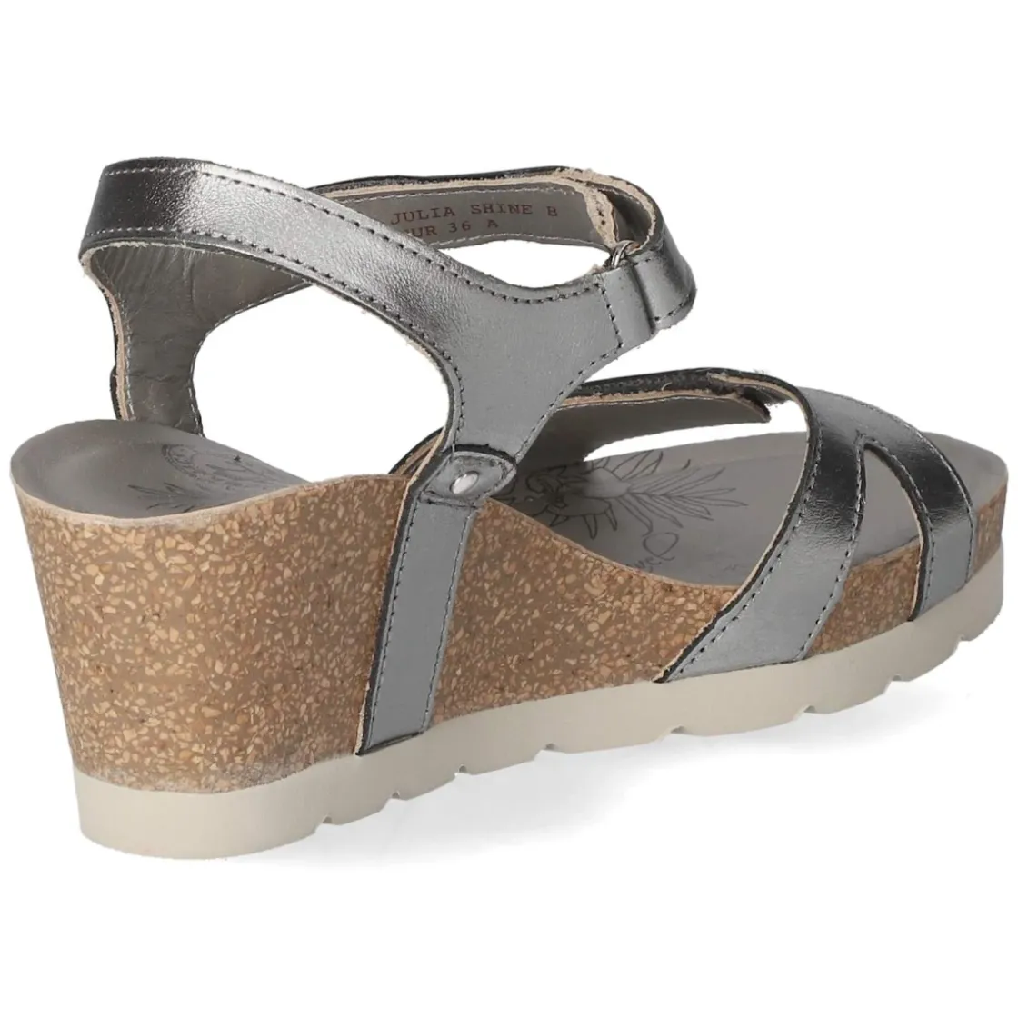 Die Sandaletten JULIA SHINE von Panama Jack vereinen funkelnden Auftritt mit durchdachtem Komfort. Das silberne Glattleder setzt elegante Akzente, während atmungsaktives Echtleder und die Lederdecksohle für ein angenehmes Fußklima sorgen. Ein gepolstertes Fußbett verwöhnt bei jedem Schritt, der 6 cm hohe Keilabsatz verlängert die Silhouette und bietet zugleich stabile Trittsicherheit. Zwei praktische Klettverschlüsse erlauben eine individuelle Anpassung am Fußrücken und am Knöchel, die flexible, rutschhemmende Laufsohle unterstützt verlässlichen Halt. Mit offener Schuhspitze und normaler Passform entsteht eine alltagstaugliche Sommer-Sandale, die vom Stadtbummel bis zur Abendverabredung überzeugt. Modetipp: Zu einem weißen Leinenkleid und einer filigranen Silberkette getragen, entsteht ein cleaner Look; mit hellen Denim-Shorts und Satin-Top wirkt der Metallic-Schimmer besonders modern.