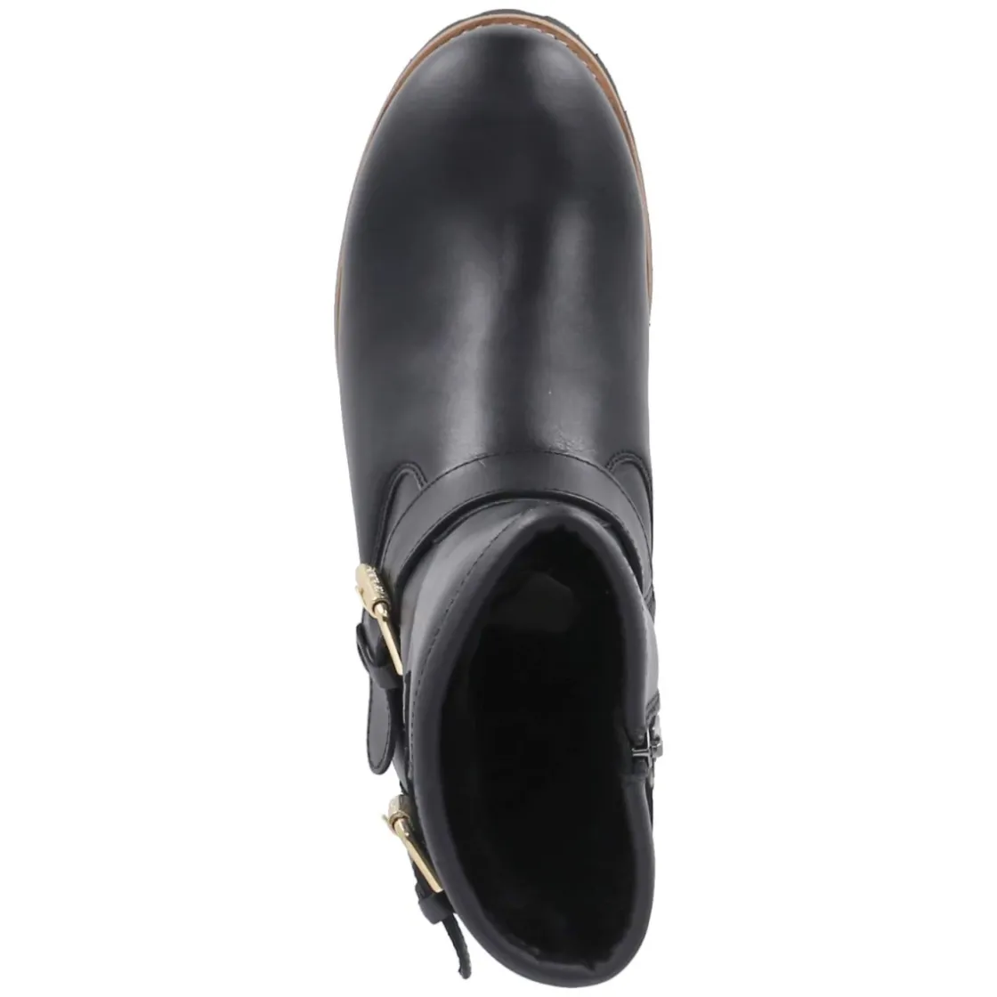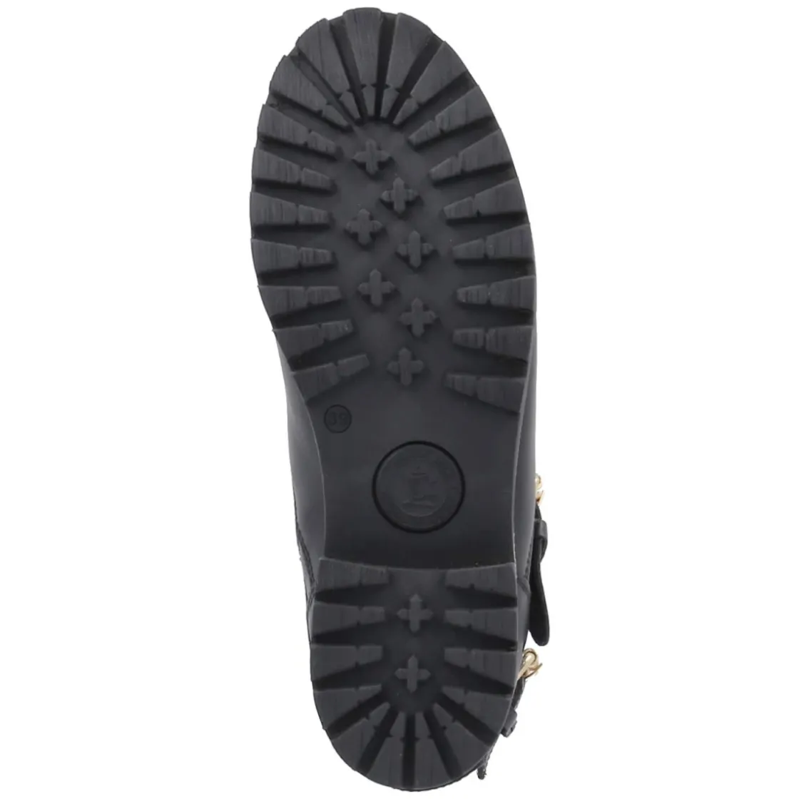 Der Winterboots FELINA IGLOO von Panama Jack vereint funktionale Stärke mit markantem Design. Schwarzes Glattleder, ein verstärkter Fersenbereich mit Logopatch sowie zwei Zierriemen mit Metallschnalle in Goldoptik setzen hochwertige Akzente. Das warme Lammfellfutter und die Lederdecksohle sorgen für behagliches Klima, während das Wechselfußbett individuellen Komfort ermöglicht. Dank wasserfester, zugleich atmungsaktiver Ausführung bleiben Füße trocken und angenehm temperiert. Der bequeme Reißverschlußeinstieg, die runde Spitze und der 3,5 cm hohe Blockabsatz unterstützen Alltagstauglichkeit. Eine robust vernähte, rutschhemmende Profillaufsohle liefert sicheren Halt. In klassischem Schwarz und normaler Passform gelingt der Auftritt mühelos. Modetipp: Mit Wollmantel, Strickkleid und blickdichter Strumpfhose entsteht ein stilvolles Winter-Ensemble mit elegantem Kontrast zur Goldoptik der Schnallen.