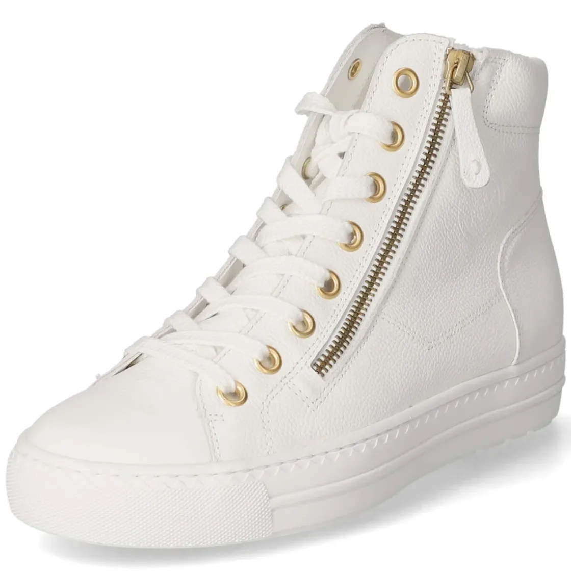 Der High Sneaker von Paul Green bringt cleanen Weißton und fein gearbeitetes Glattleder in eine zeitlose Silhouette, die Damen im Alltag wie auf Reisen begleitet. Atmungsaktives Echtleder und eine lederne Decksohle sorgen für ein ausgeglichenes Fußklima, das gepolsterte Fußbett und der weich gepolsterte Einstieg bieten langanhaltenden Komfort. Die runde Spitze lässt den Look lässig wirken, während goldfarbene Akzente an Schnürung und Reißverschluss eine edle Note setzen. Praktisch: Neben der Schnürung erleichtert der zusätzliche Reißverschluss das An- und Ausziehen. Eine flexible Laufsohle mit Grip gibt sicheren Halt, die verstärkte Ferse stabilisiert bei jedem Schritt. Ziernähte und dezente Markendetails runden das Design ab. Der Schuh fällt normal aus. Modetipp: Besonders modern wirkt der Sneaker zu Cropped-Jeans und Trenchcoat oder als stilvoller Kontrast zu einem fließenden Midikleid.
