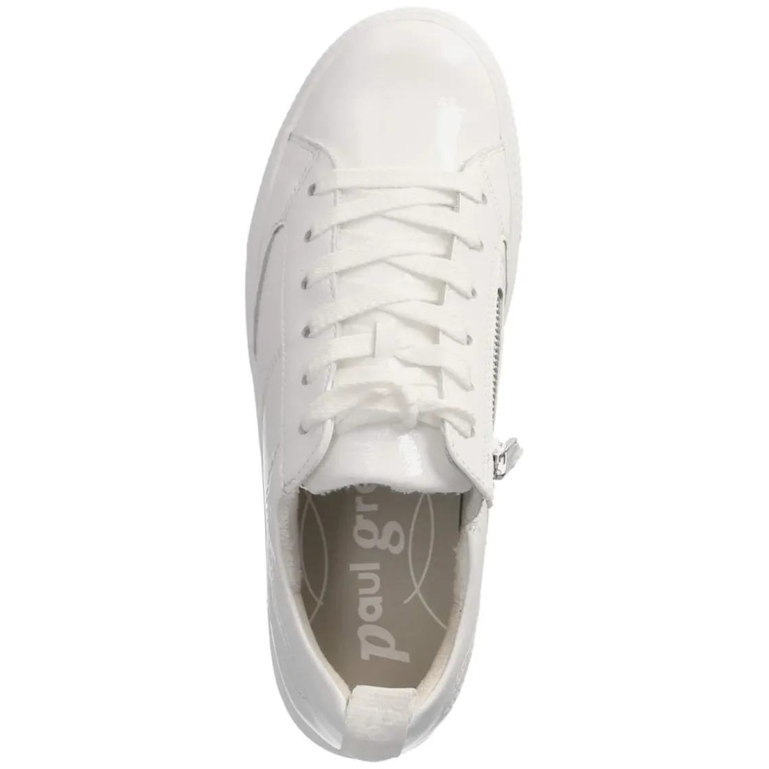 Der Low Sneaker von Paul Green setzt in strahlendem Weiß auf eine elegante Lackoptik, die jedem Look eine moderne Frische verleiht. Das rund zulaufende Design wirkt feminin, während Schnürung und zusätzlicher Reißverschluss das An- und Ausziehen angenehm erleichtern. Ein weich gepolsterter Einstieg, die verstärkte Ferse und die flexible Laufsohle sorgen den ganzen Tag für komfortablen Halt. Die lederne Decksohle sowie das gepolsterte, herausnehmbare Wechselfußbett bieten ein angenehmes Fußklima und ermöglichen bei Bedarf das Tragen eigener Einlagen. Ziernähte und feine Markendetails unterstreichen den hochwertigen Charakter. Der Schuh fällt normal aus und überzeugt damit als verlässlicher Begleiter im Alltag wie zu smarten Anlässen. Modetipp: Für einen cleanen City-Look mit Cropped-Jeans, weißem T‑Shirt und Oversize-Blazer kombinieren, dazu eine filigrane Crossbody-Bag.