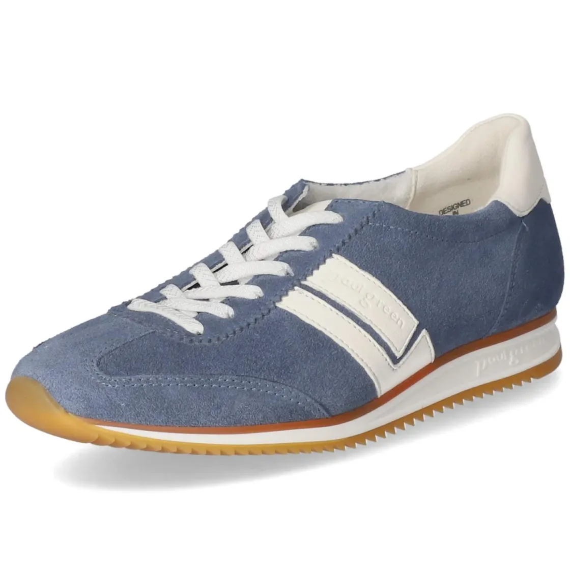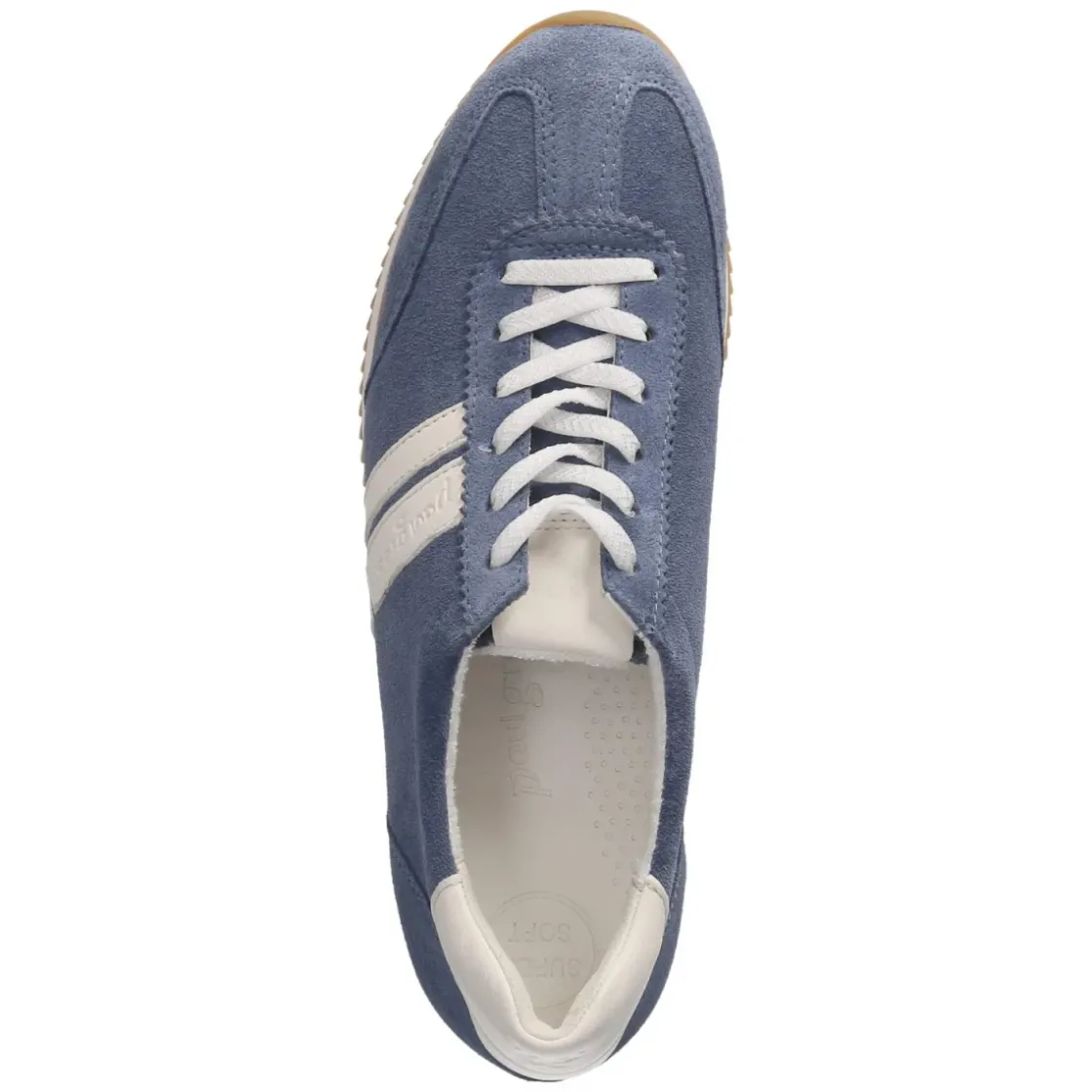 Der Low Sneaker von Paul Green verbindet sportliche Leichtigkeit mit femininer Eleganz. Weiches, blaues Rauleder und weißfarbene Akzente mit feinen Markendetails schaffen einen frischen Look, der zu City-Styles ebenso passt wie zu smarten Casual-Outfits. Die runde Schuhspitze und die Schnürung ermöglichen eine komfortable, individuelle Anpassung, während atmungsaktives Echtleder innen für ein angenehmes Fußklima sorgt. Eine hautfreundliche Lederdecksohle und das gepolsterte Lederfußbett bieten spürbaren Komfort, verstärkte Zehen- und Fersenbereiche erhöhen die Formstabilität. Der leicht gepolsterte Einstieg schont den Knöchel, die flexible, rutschhemmende Laufsohle gibt verlässlichen Halt im Alltag. Der Sneaker fällt normal aus und richtet sich an Damen, die Wert auf Qualität und Tragekomfort legen. Modetipp: Zur Wide-Leg-Jeans und einem hellen Trenchcoat entsteht ein moderner, lässig-eleganter Look.