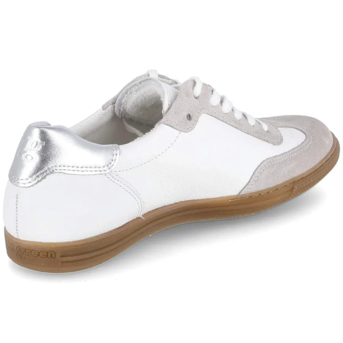 Der Low Sneaker von Paul Green vereint zeitlose Klarheit mit moderner Retro-Optik. Das weiße Echtleder zeigt eine besonders langlebige Qualität, die durch den verstärkten Zehen- und Fersenbereich zusätzlich geschützt wird. Eine silberne Fersenklappe setzt einen dezenten Glanzakzent und unterstreicht das gelabelte Design. Für Komfort sorgen die hautfreundliche Lederdecksohle und das weich gepolsterte Lederfußbett. Die runde Spitze und die klassische Schnürung bieten eine angenehme Passform, die regulär ausfällt, während die flexible, rutschhemmende Laufsohle verlässlichen Grip im Alltag liefert. Der niedrige Schnitt trägt sich leicht und vielseitig – vom City-Look bis zum Office Casual. Modetipp: Zu locker sitzender Mom-Jeans, cleanem Weißshirt und einem grauen Blazer entsteht ein lässig-eleganter Kontrast; fein gerippte Strümpfe in Off-White greifen die Helligkeit des Schuhs effektvoll auf.